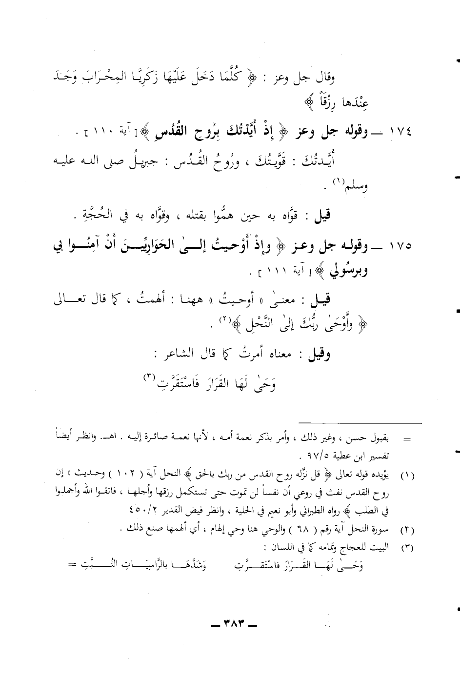 وقال جل وعز (كلما دخل عليها زكريا المحراب وجد عندها رزقا) 174 وقوله جل وعز (إذ أيدتك بروح القدس) أيدتك قويتك وروح القدس جبريل صلى الله عليه وسلم قيل قواه به حين هموا بقتله وقواه به في الحجة 175 وقوله جل وعز (واذ أوحيت الى الحواريين أن آمنوا بي وبرسولي) قيل معنى أوحيت ههنا ألهمت كما قال تعالى (وأوحى ربك الى النحل)