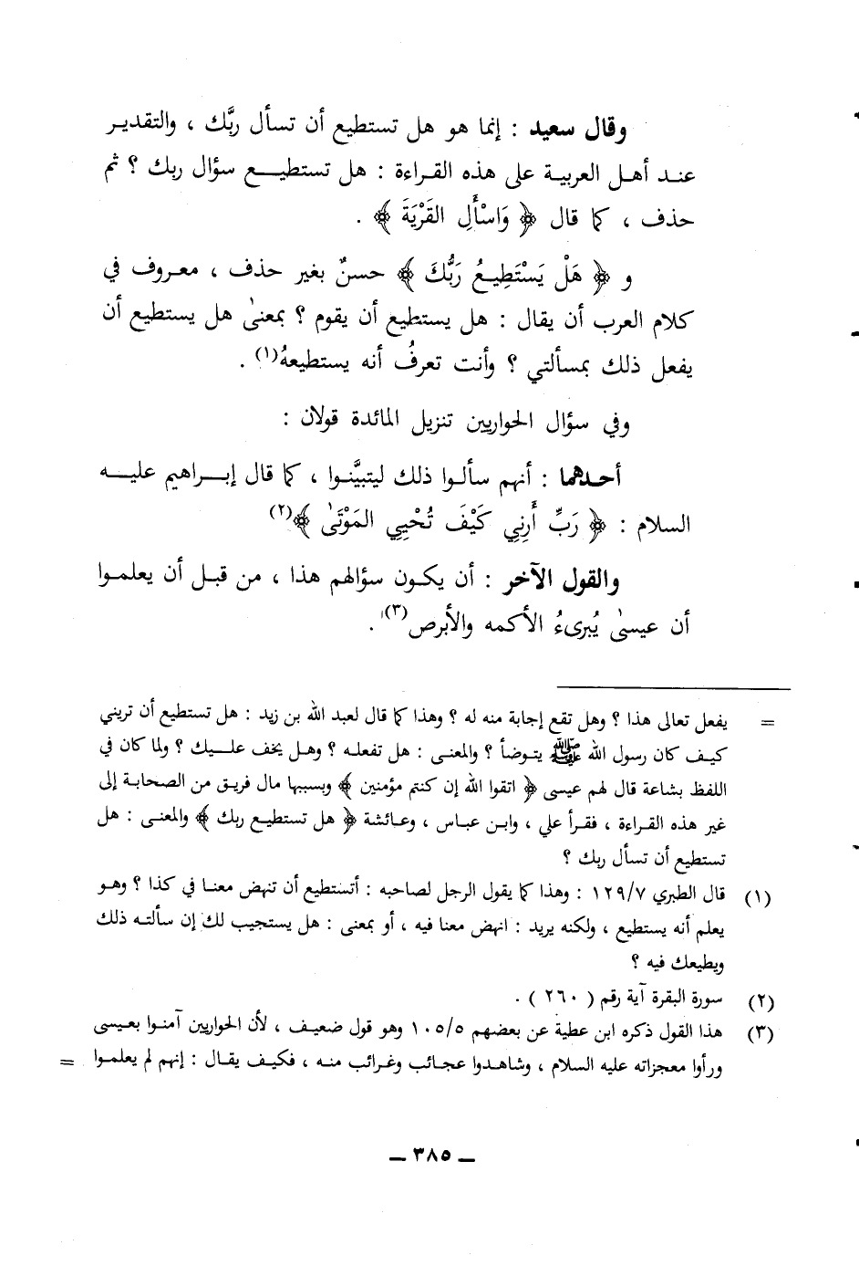 وقال سعيد انما هو هل تستطيع أن تسأل ربك والتقدير عند أهل العربية على هذه القراءة هل تستطيع سؤال ربك ثم حذف كما قال (واسأل القرية) و (هل يستطيع ربك) حسن بغير حذف معروف في كلام العرب أن يقال هل يستطيع أن يقوم بمعنى هل يستطيع أن يفعل ذلك بمسألتي وأنت تعرف أنه يستطيعه وفي سؤال الحواريين تنزيل المائدة قولان أحدهما أنهم سألوا ذلك ليتبينوا كما قال ابراهيم عليه