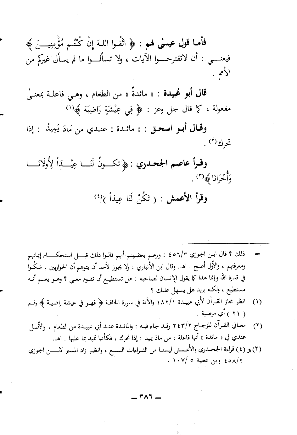 فأما قول عيسى لهم (اتقوا الله إن كنتم مؤمنين) فيعني أن لا تقترحوا الآيات ولا تسألوا ما لم يسأل غيركم من الامم قال أبو عبيدة (مائدة) من الطعام وهي فاعلة بمعنى مفعولة كما قال جل وعز (في عيشة راضية) وقال أبو اسحق (مائدة) عندي من ماد يميد إذا تحرك وقرأ عاصم الجحدري (تكون لنا عيدا لاولانا وقد وأخرانا) وقرأ الاعمش (تكن لنا عيدا)