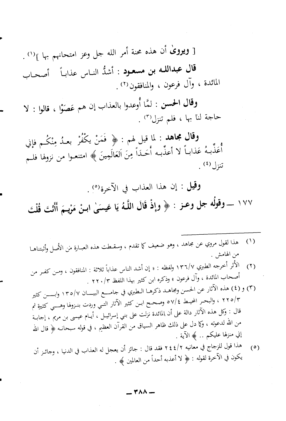 ويروى أن هذه محنة أمر الله جل وعز امتحانهم بها قال عبد الله بن مسعود أشد الناس عذابا أصحاب المائدة وآل فرعون والمنافقون وقال الحسن لما أو عدوا بالعذاب ان هم عصوا قالوا لا حاجة لنا بها فلم تنزل وقال مجاهد لما قيل لهم (فمن يكفر بعد منكم فاني أعذبه عذابا لا أعذبه أحدا من العالمين) امتنعوا من نزولها لم تنزل وقيل ان هذا العذاب في الآخرة 177 وقوله جل وعز (واذ قال الله يا عيسى ابن مريم أأنت قلت