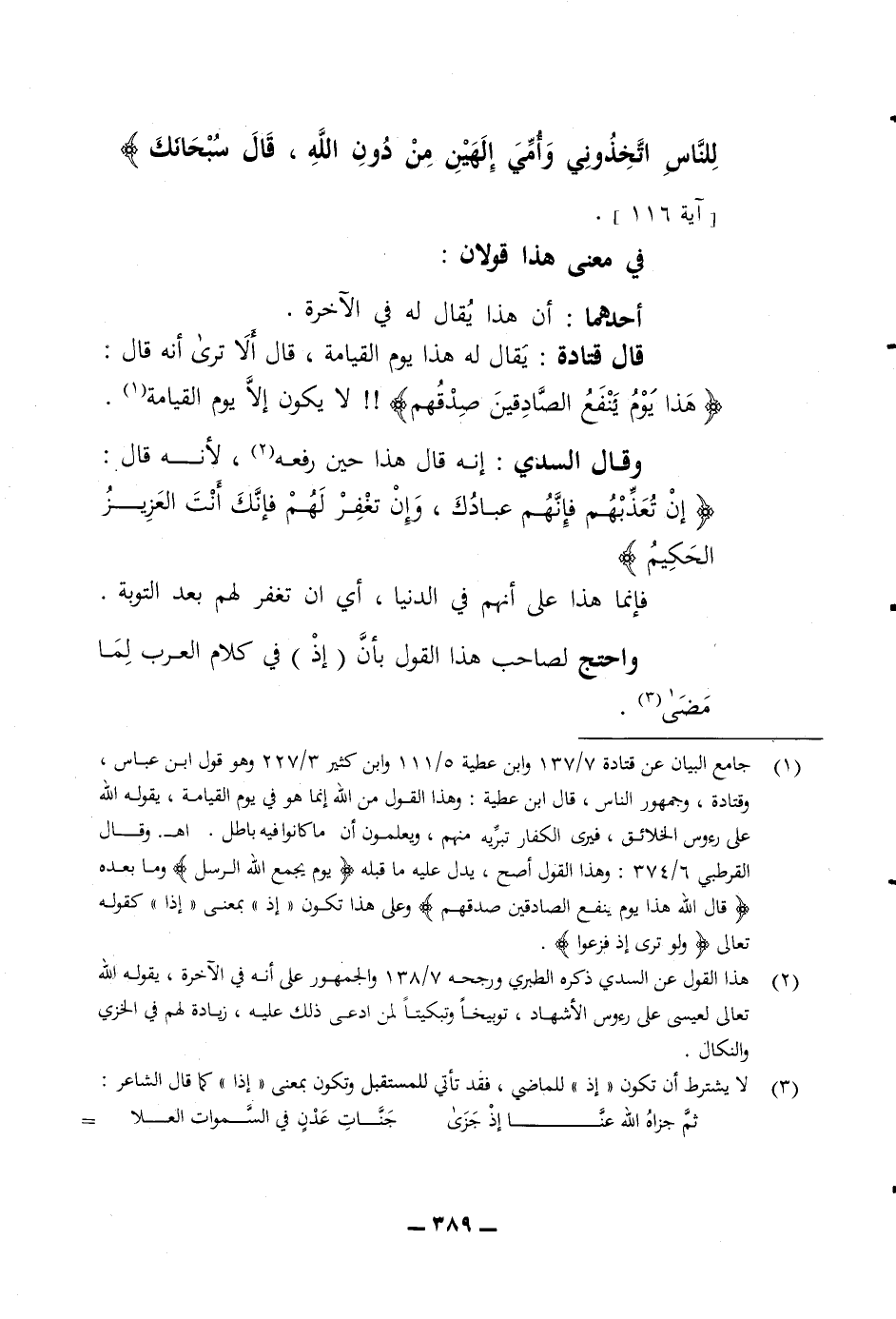للناس اتخذوني وأمي الهين من دون الله قال سبحانك) في معنى هذا قولان أحدهما أن هذا يقال له في الآخرة قال قتادة يقال له هذا يوم القيامة قال ألا ترى أنه قال (هذا يوم ينفع الصادقين صدقهم) لا يكون الا يوم القيامة وقال السدي انه قال هذا حين رفعه لانه قال