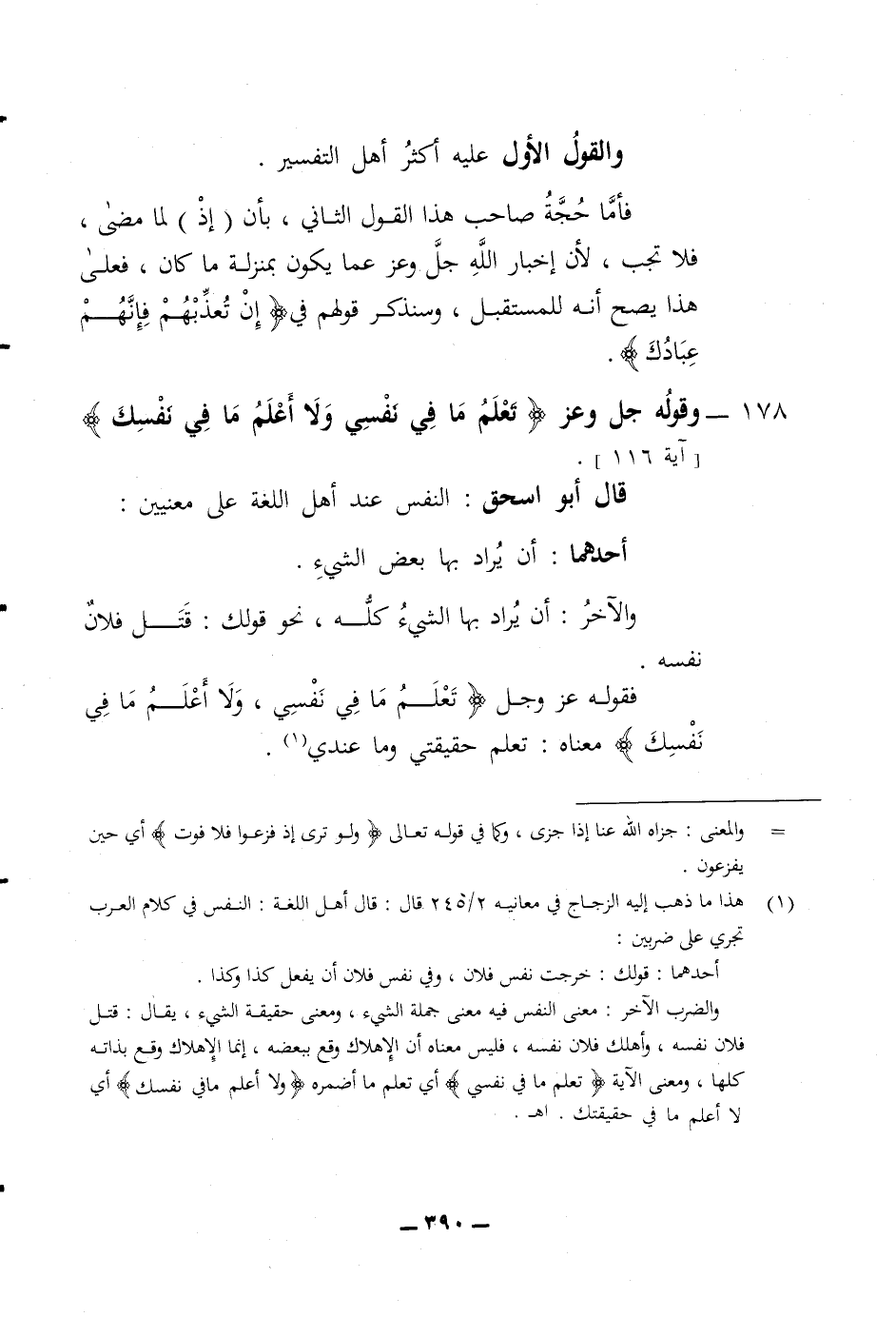 والقول الاول عليه أكثر أهل التفسير فأما حجة صاحب هذا القول الثاني بأن (إذ) لما مضى فلا تجب لان اخبار الله جل وعز عما يكون بمنزلة ما كان فعلى هذا يصح أنه للمستقبل وسنذكر قولهم في (ان تعذبهم فانهم عبادك) 178 وقوله جل وعز (تعلم ما في نفسي ولا أعلم ما في نفسك) قال أبو اسحق النفس عند أهل اللغة على معنيين أحدهما أن يراد بها بعض الشئ والآخر أن يراد بها الشئ كله نحو قولك قتل فلان نفسه فقوله عز وجل (تعلم ما في نفسي ولا أعلم ما في نفسك) معناه تعلم حقيقتي وما عندي
