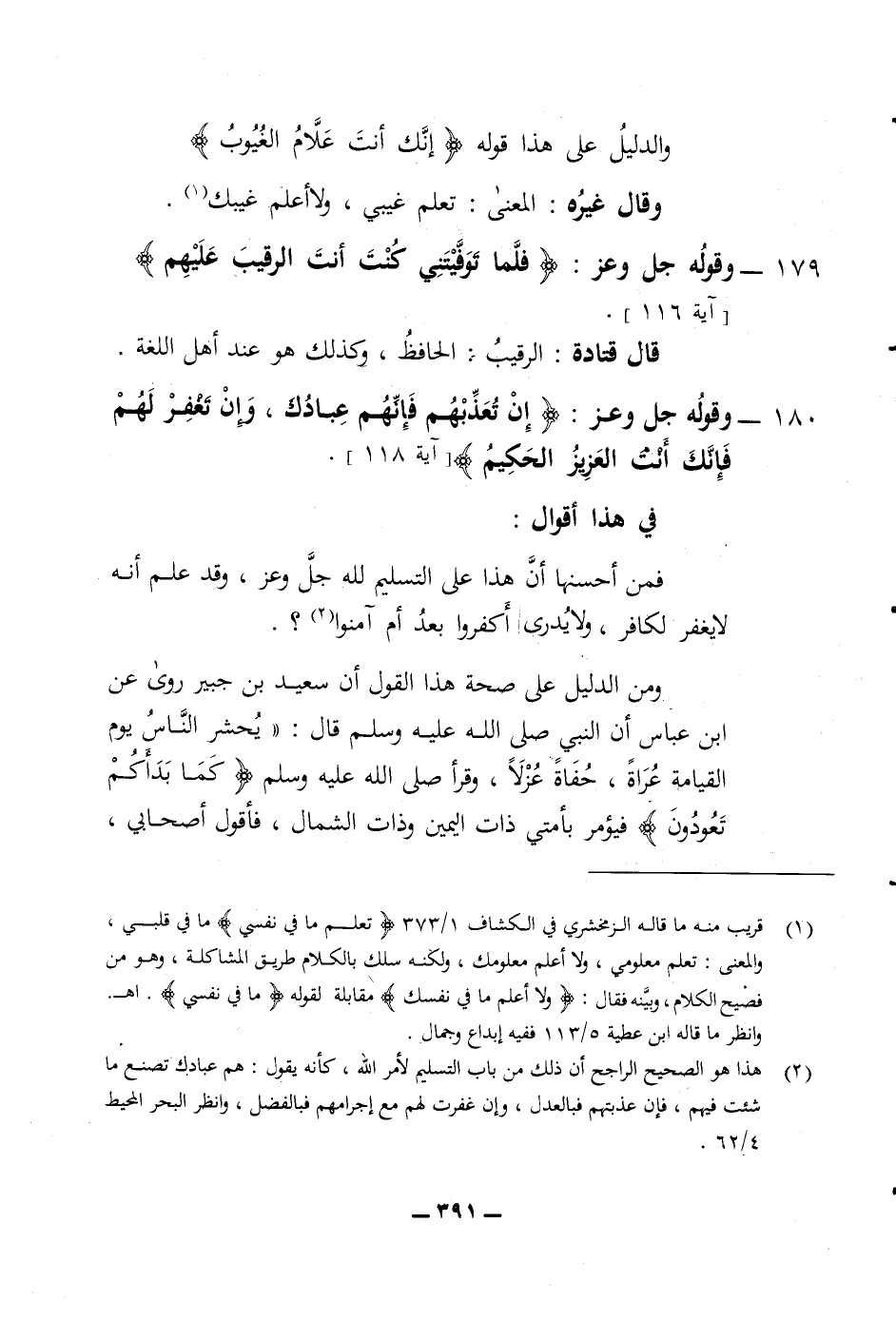 والدليل على هذا قوله (انك أنت علام الغيوب) وقال غيره تعلم غيبي ولا أعلم غيبك 179 وقوله جل وعز (فلما توفيتني كنت أنت الرقيب عليهم)