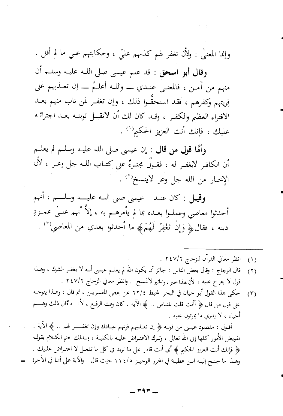 وانما المعنى ولان تغفر لهم كذبهم علي وحكايتهم عني ما لم أقل وقال أبو اسحق قد علم عيسى صلى الله عليه وسلم أن منهم من آمن فالمعنى عندي والله أعلم ان تعذبهم على فريتهم وكفرهم فقد استحقوا ذلك وان تغفر لمن تاب منهم بعد الافتراء العظيم والكفر وقد كان لك أن لا تقبل توبته بعد اجترائه عليك فانك أنت العزيز الحكيم وأما قول من قال ان عيسى صلى الله عليه وسلم لم يعلم أن الكافر لا يغفر له فقول مجترء حتى على كتاب الله جل وعز لان الاخبار من الله جل وعز لا ينسخ وقيل كان عند عيسى صلى الله عليه وسلم أنهم أحدثوا معاصي وعملوا بعده بما لم يأمرهم به الا أنهم على عمود دينه فقال (وان تغفر لهم) ما أحدثوا بعدي من المعاصي