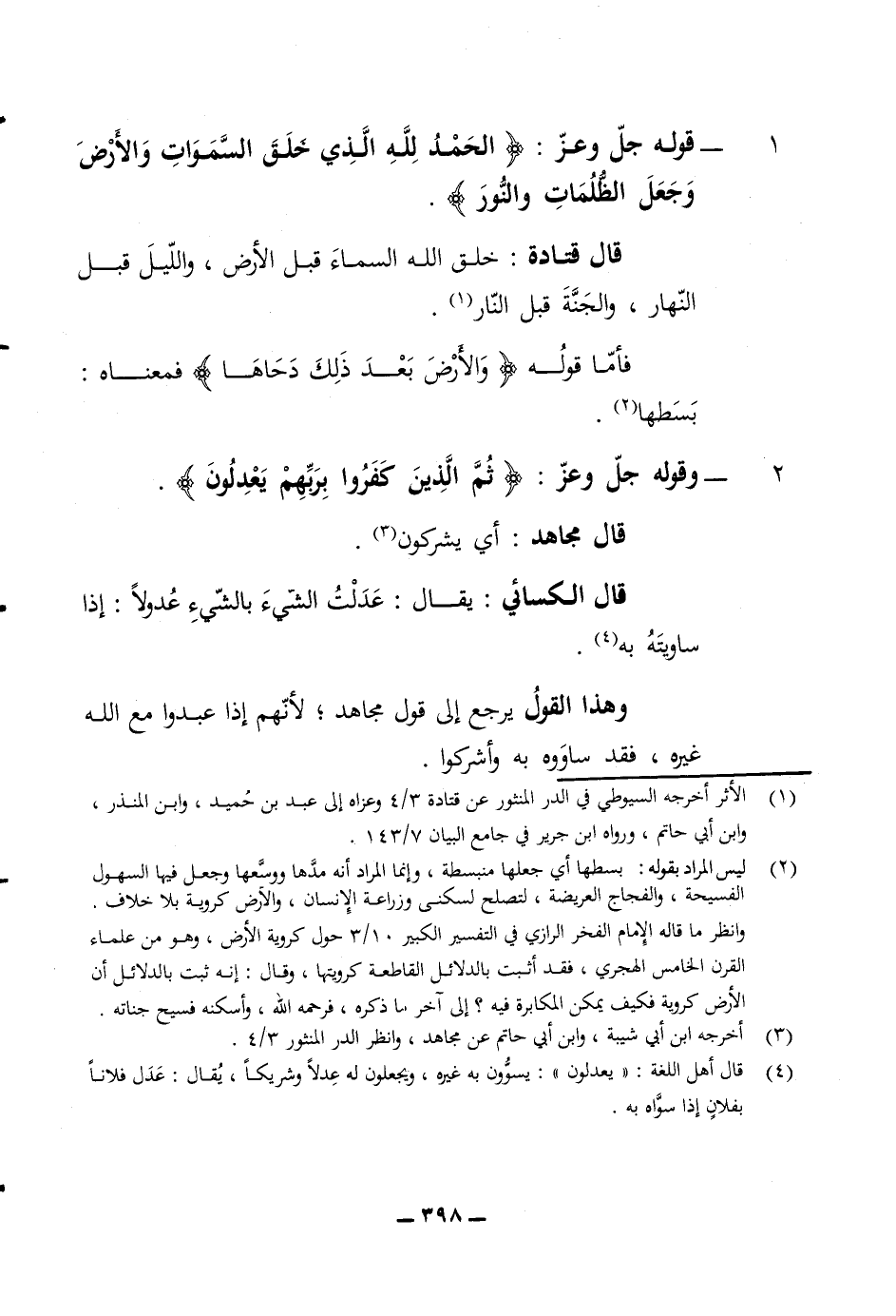 1 قوله جل وعز (الحمد لله الذي خلق السموات والارض وجعل الظلمات والنور) قال قتادة خلق الله السماء قبل الارض والليل قبل النهار والجنة قبل النار فأما قوله (والارض بعد ذلك دحاها) فمعناه بسطها 2 وقوله جل وعز (ثم الذين كفروا بربهم يعدلون) قال مجاهد أي يشركون