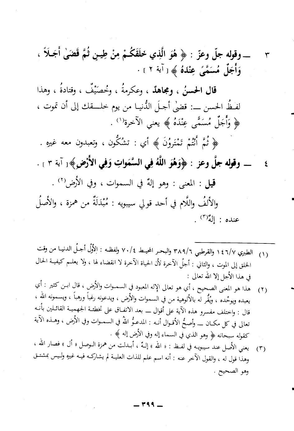 3 وقوله جل وعز (هو الذي خلقكم من طين ثم قضى أجلا وأجل مسمى عنده) قال الحسن ومجاهد وعكرمة وخصيف وقتادة وهذا لفظ الحسن قضى أجل الدنيا من يوم خلقك الى أن تموت (وأجل مسمى عنده) يعني الآخرة (ثم أنتم تمترون) أي تشكون وتعبدون معه غيره 4 وقوله جل وعز (وهو الله في السموات وفي الارض) والالف واللام في أحد قولي سيبويه مبدلة من همزة والاصل عنده اله