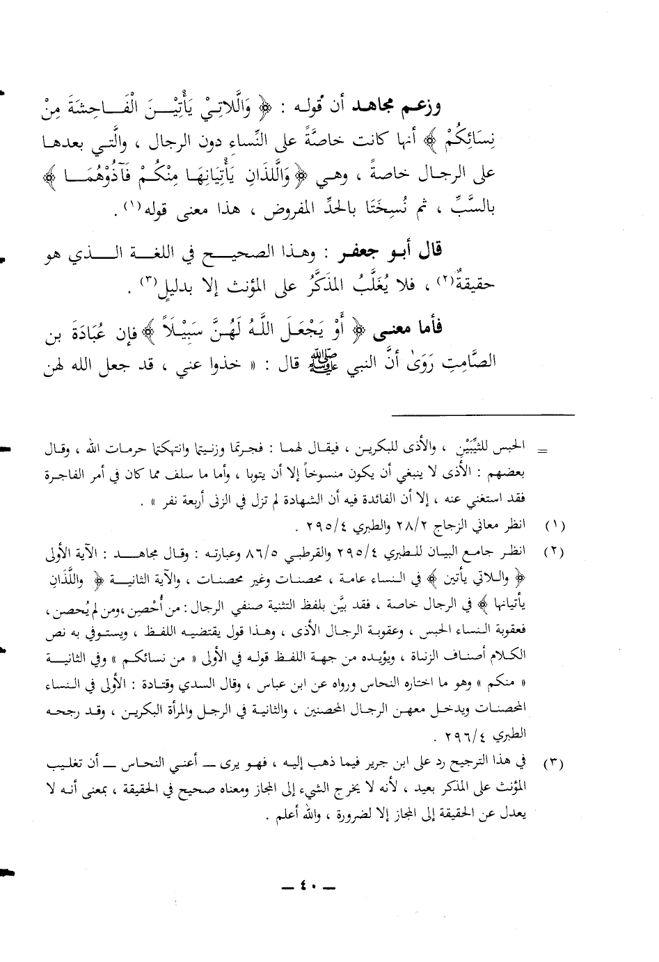 وزعم مجاهد أن قوله (واللاتي يأتين الفاحشة من نسائكم) أنها كانت خاصة على النساء دون الرجال والتي بعدها على الرجال خاصة وهي (واللذان يأتيانها منكم فآذوهما) بالسب ثم نسختا بالحد المفروض هذا معنى قوله قال أبو جعفر وهذا الصحيح في اللغة الذي هو حقيقة فلا يغلب المذكر على المؤنث الا بدليل فأما معنى (أو يجعل الله لهن سبيلا) فان عبادة بن الصامت روى أن النبي صلى الله عليه وسلم قال (خذوا عني قد جعل الله لهن