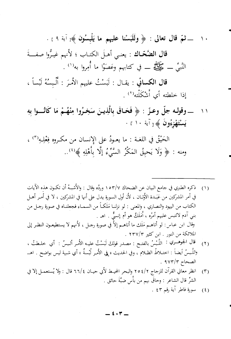 10 ثم قال تعالى (وللبسنا عليهم ما يلبسون) قال الضحاك يعني أهل الكتاب لانهم غيروا صفة النبي صلى الله عليه وسلم في كتابهم وعصوا ما أمروا به قال الكسائي يقال لبست عليهم الامر ألبسه لبسا إذا خلطته أي أشكلته عمر 11 وقوله جل وعز (فحاق بالذين سخروا منهم ما كانوا به يستهزءون) الحيق في اللغة ما يعود على الانسان من مكروه فعله ومنه (ولا يحيق المكر السئ الا بأهله)