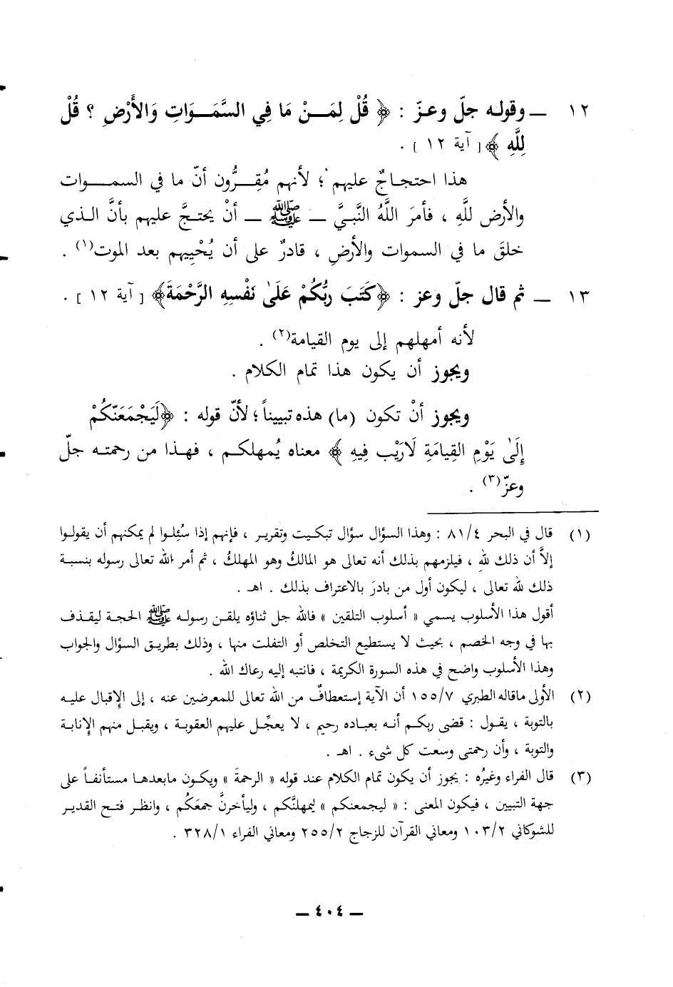 13 ثم قال جل وعز (كتب ربكم على نفسه الرحمة) لانه أمهلهم الى يوم القيامة ويجوز أن يكون هذا تمام الكلام ويجوز أن تكون (ما) هذه تبيينا لان قوله (ليجمعنكم الى يوم القيامة لا ريب فيه) معناه يمهلكم فهذا من رحمته جل وعز