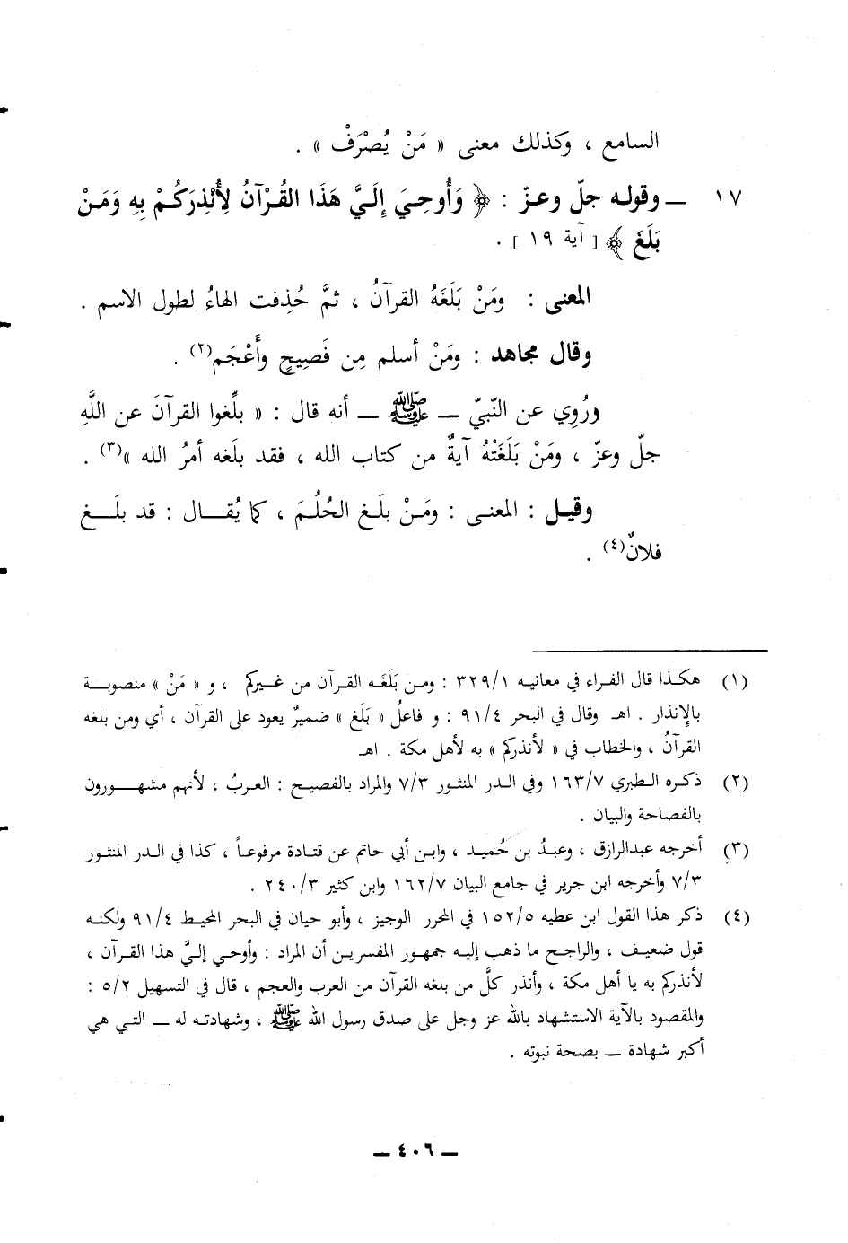 السامع وكذلك معنى (من يصرف) 17 وقوله جل وعز (وأوحي إلي هذا القرآن لانذركم به ومن بلغ) المعنى ومن بلغه القرآن ثم حذف الهاء لطول الاسم وقال مجاهد ومن أسلم من فصيح وأعجم وروي عن النبي صلى الله عليه وسلم أنه قال (بلغوا القرآن عن الله جل وعز ومن بلغته آية من كتاب الله فقد بلغه أمر الله) وقيل المعنى ومن بلغ الحلم كما يقال قد بلغ