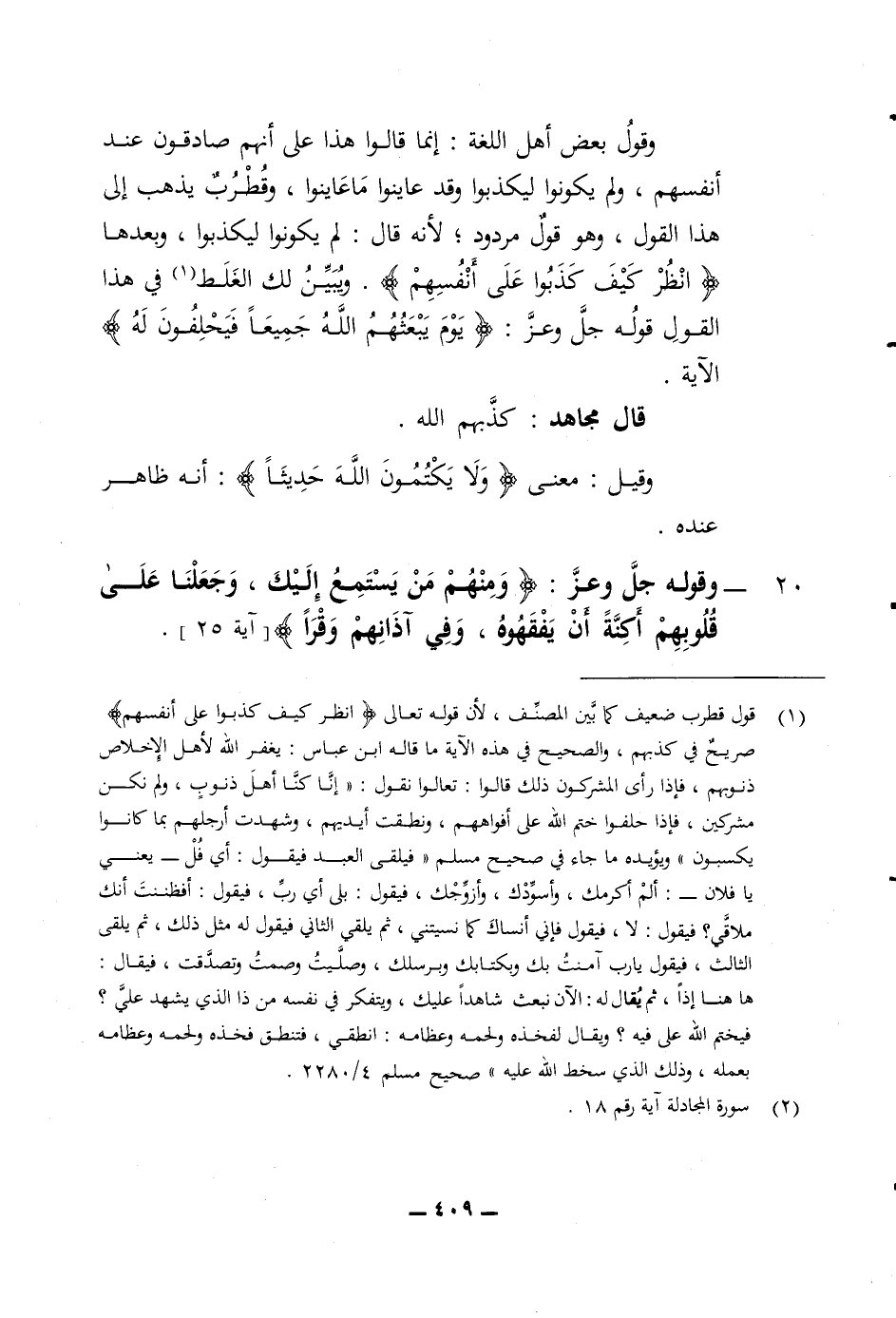 وقول بعض أهل اللغة انما قالوا هذا على أنهم صادقون عند أنفسهم ولم يكونوا ليكذبوا وقد عاينوا ما عاينوا وقطرب يذهب الى هذا القول وهو قول مردود لانه قال لم يكونوا ليكذبوا وبعدها (انظر كيف كذبوا على أنفسهم) ويبين لك الغلط في هذا القول قوله جل وعز (يوم يبعثهم الله جميعا فيحلفون له) الآية قال مجاهد كذبهم الله وقيل معنى (ولا يكتمون الله حديثا) أنه ظاهر عنده 20 وقوله جل وعز (ومنهم من يستمع اليك وجعلنا على قلوبهم أكنة أن يفقهوه وفي آذانهم وقرا)