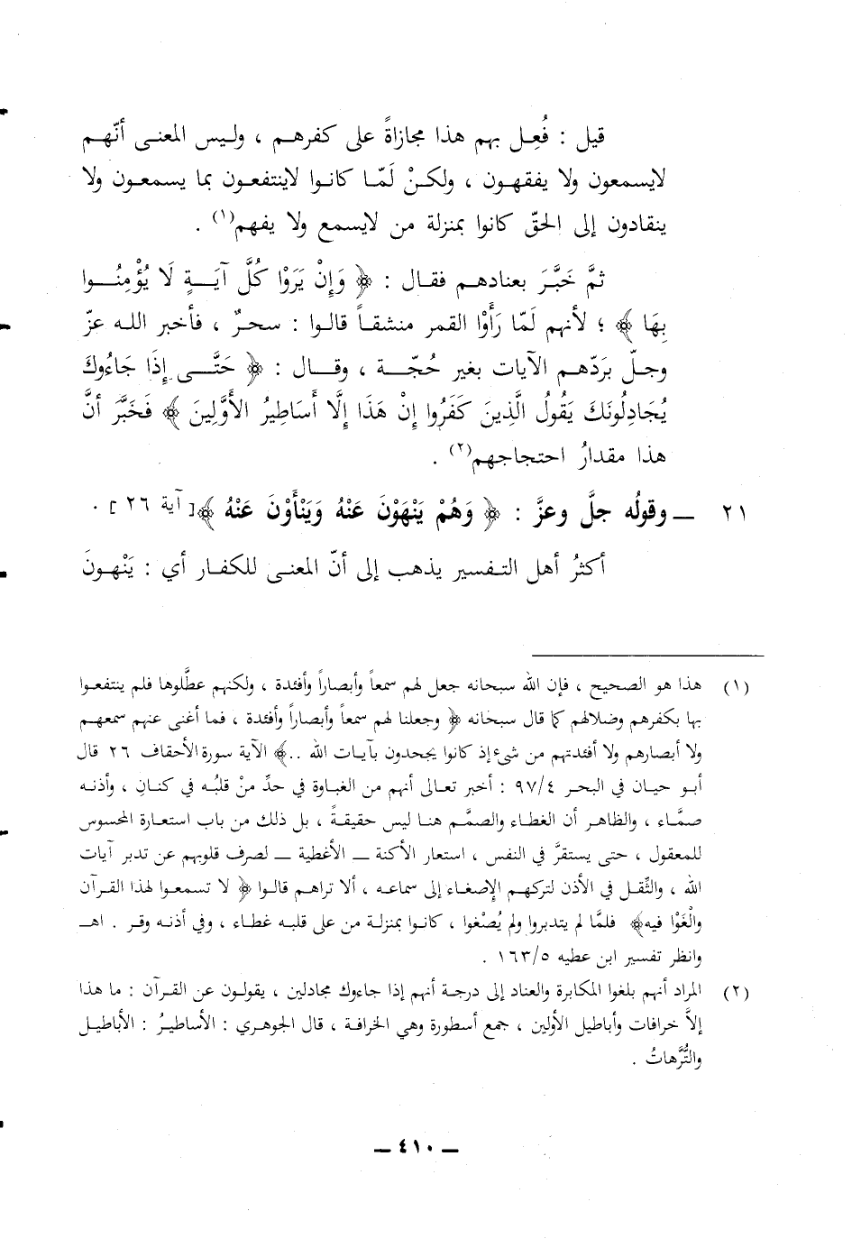 ينقادون الى الحق كانوا بمنزلة من لا يسمع ولا يفهم ثم خبر بعنادهم فقال (وان يروا كل آية لا يؤمنوا بها) لانهم لما رأوا القمر منشقا قالوا سحر فأخبر الله عز وجل بردهم الآيات بغير حجة وقال (حتى إذا جاءوك يجادلونك يقول الذين كفروا ان هذا الا أساطير الاولين) فخبر أن هذا مقدار احتجاجهم 21 وقوله جل وعز (وهم ينهون عنه وينأون عنه) أكثر أهل التفسير يذهب الى أن المعنى للكفار أي ينهون