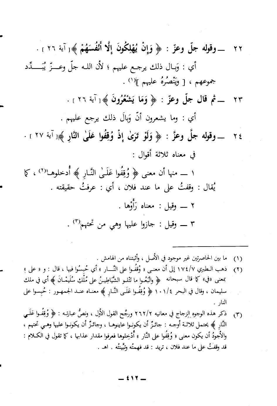 24 وقوله جل وعز (ولو ترى إذ وقفوا على النار) في معناه ثلاثة أقوال 1 منها أن معنى (وقفوا على النار) أدخلوها كما يقال وقفت على ما عند فلان أي عرفت حقيقته 2 وقيل معناه رأوها 3 وقيل جاوزا عليها وهي من تحتهم