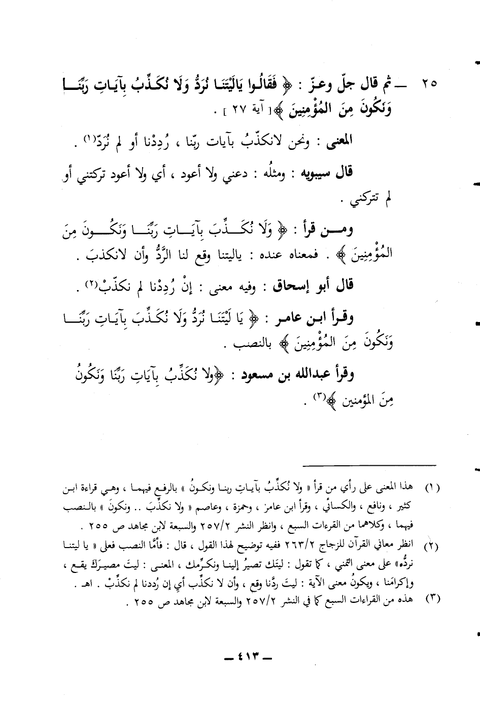 25 ثم قال جل وعز (فقالوا يا ليتنا نرد ولا نكذب بآيات ربنا ونكون من المؤمنين) المعنى ونحن لا نكذب بآيات ربنا رددنا أو لم نرد قال سيبوبه ومثله دعني ولا أعود أي ولا أعود تركتني أو لم تتركني ومن قرأ (ولا نكذب بآيات ربنا ونكون من المؤمنين) فمعناه عنده يا ليتنا وقع لنا الرد وأن لا نكذب قال أبو اسحاق وفيه معنى ان رددنا لم نكذب وقرأ ابن عامر (يا ليتنا نرد ولا نكذب بآيات ربنا ونكون من المؤمنين) بالنصب وقرأ عبد الله بن مسعود (ولا نكذب بآيات ربنا ونكون من المؤمنين)