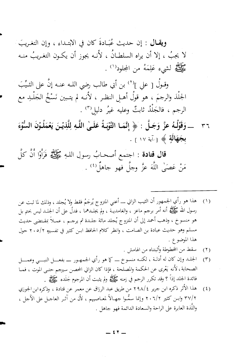 ويقال ان حديث عبادة كان في الابتداء وان التغريب لا يجب الا أن يراه السلطان لانه يجوز أن يكون التغريب منه صلى الله عليه وسلم لشئ علمه من المجلود وقول (علي) بن أبي طالب رضي الله عنه ان على الثيب الجلد والرجم هو قول أهل النظر لانه لم يتبين نسخ الجلد مع الرجم فالجلد ثابت وعليه غير دليل 36 وقوله عز وجل (انما التوبة على الله للذين يعملون السوء بجهالة) قال قتادة اجتمع أصحاب رسول الله صلى الله عليه وسلم فرأوا أن كل من عصى الله عز وجل فهو جاهل