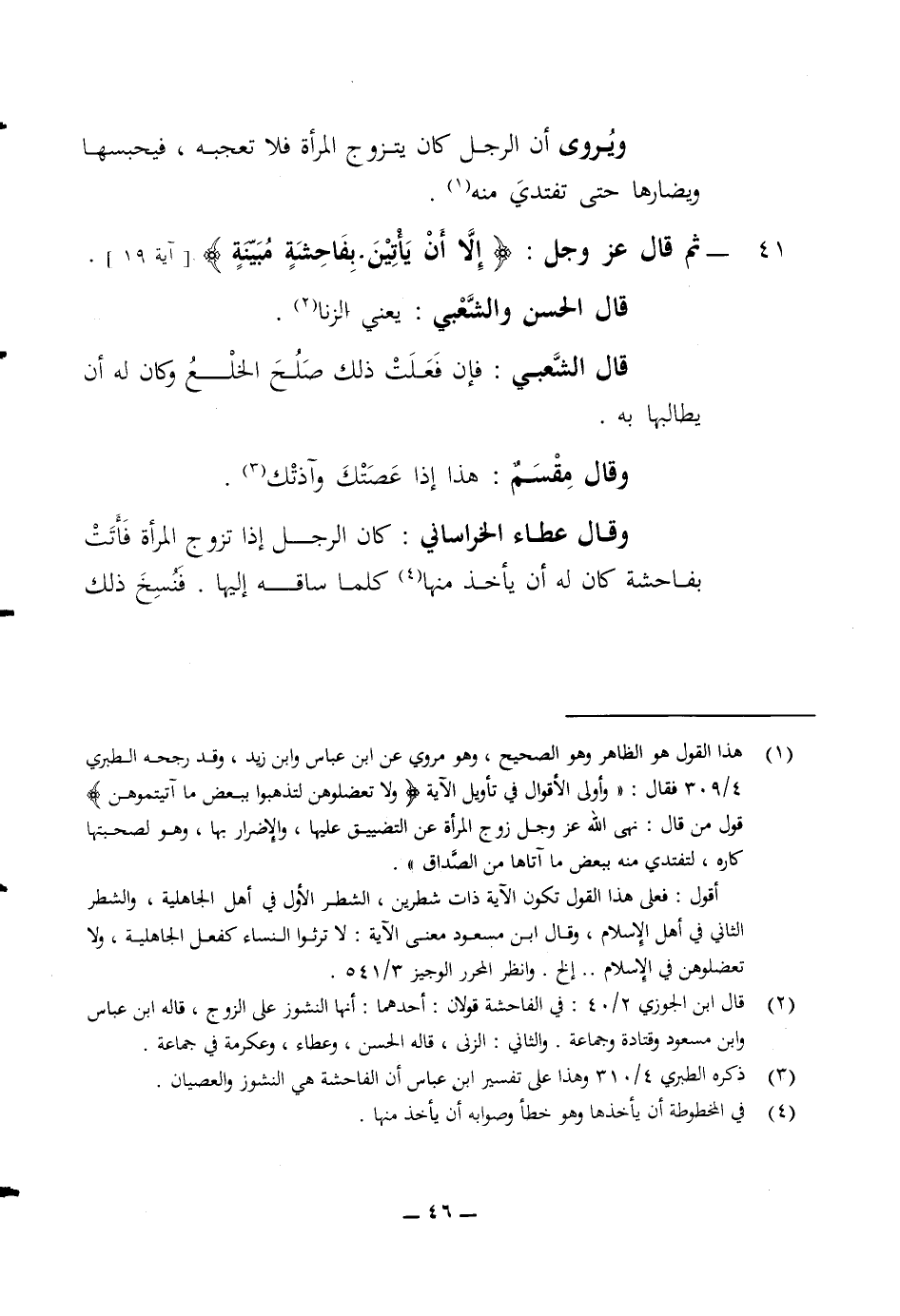 ويروى أن الرجل كان يتزوج المرأة فلا تعجبه فيحبسها ويضارها حتى تفتدي منه 41 ثم قال عز وجل (الا أن يأتين بفاحشة مبينة) قال الحسن والشعبي يعني الزنا قال الشعبي فان فعلت ذلك صلح لخلع وكان له أن يطالبها به وقال مقسم هذا إذا عصتك وآذتك وقال عطاء الخراساني كان الرجل إذا تزوج المرأة فأتت بفاحشة كان له أن يأخذ منها كلما ساقه إليها فنسخ ذلك