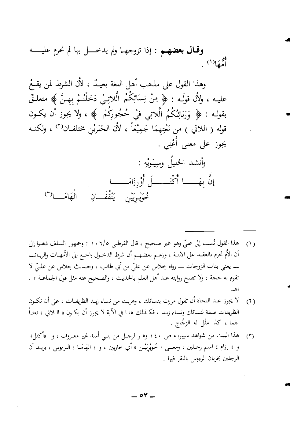 وقال بعضهم إذا تزوجها ولم يدخل بها لم تحرم عليه أمها وهذا القول على مذهب أهل اللغة بعيد لان الشرط لمن يقع عليه ولان قوله (من نسائكم اللاتي دخلتم بهن) متعلق بقوله (وربائبكم اللاتي في حجوركم) ولا يجوز أن يكون قوله (اللاتي) من نعتهما جميعا لان الخبرين مختلفان ولكنه يجوز على معنى أعني وأنشد الخليل وسيبويه ان بها أكتل اورزاما إلى خويربين ينفقان الهاما