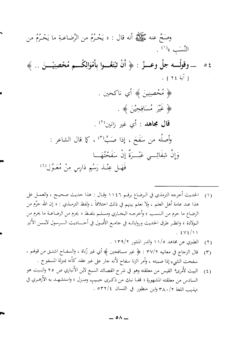 وصح عنه صلى الله عليه وسلم أنه قال يحرم من الرضاعة ما يحرم من النسب 54 وقوله جل وعز (أن تبتغوا بأموالكم محصنين) محصنين أي ناكحين غير مسافحين قال مجاهد أي غير زانين