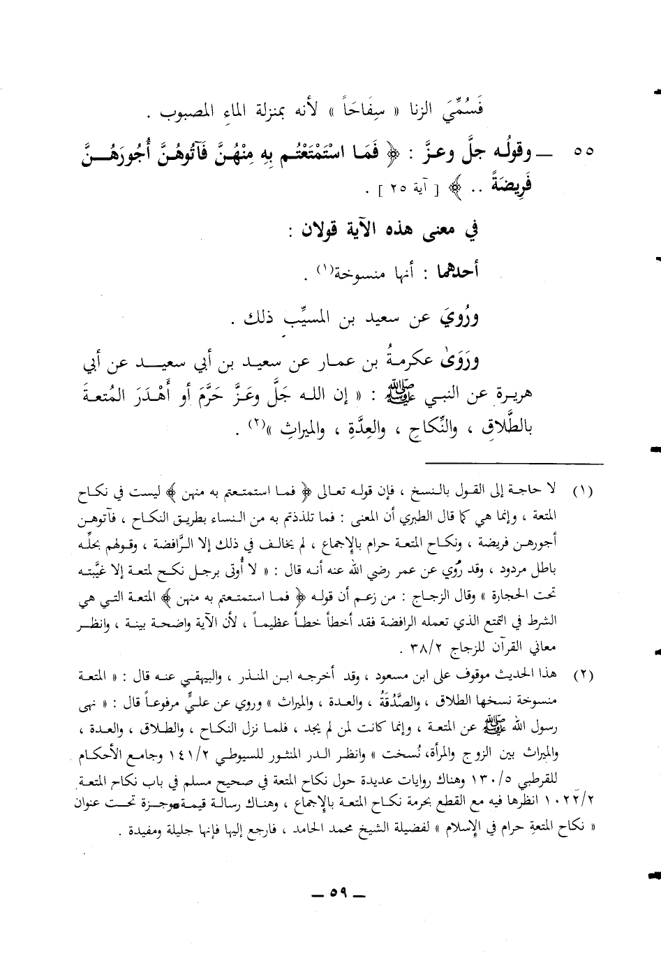 فسمي الزنا سفاحا لانه يمنزلة الماء المصبوب 55 وقوله جل وعز (فما استمتعتم به منهن فآتوهن أجورهن فريضة) في معنى هذه الآية قولان أحدهما أنها منسوخة وروي عن سعيد بن المسيب ذلك وروى عكرمة بن عمار عن سعيد بن أبي سعيد عن أبي هريرة عن النبي صلى الله عليه وسلم (إن الله جل وعز حرم أو أهدر المتعة بالطلاق والنكاح والعدة والميراث (