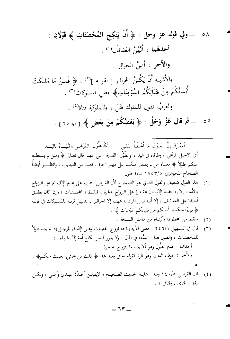 58 وفي قوله عز وجل (أن ينكح المحصنات) قولان أحدهما أنهن العفائف والآخر أنهن الحرائر والاشبه أن يكن الحرائر لقوله (فمن ما ملكت أيمانكم من فتياتكم المؤمنات) يعني المملوكات والعرب تقول للمملوك فتى وللملوكة أبو فتاة 59 ثم قال عز وجل (بعضكم من بعض)