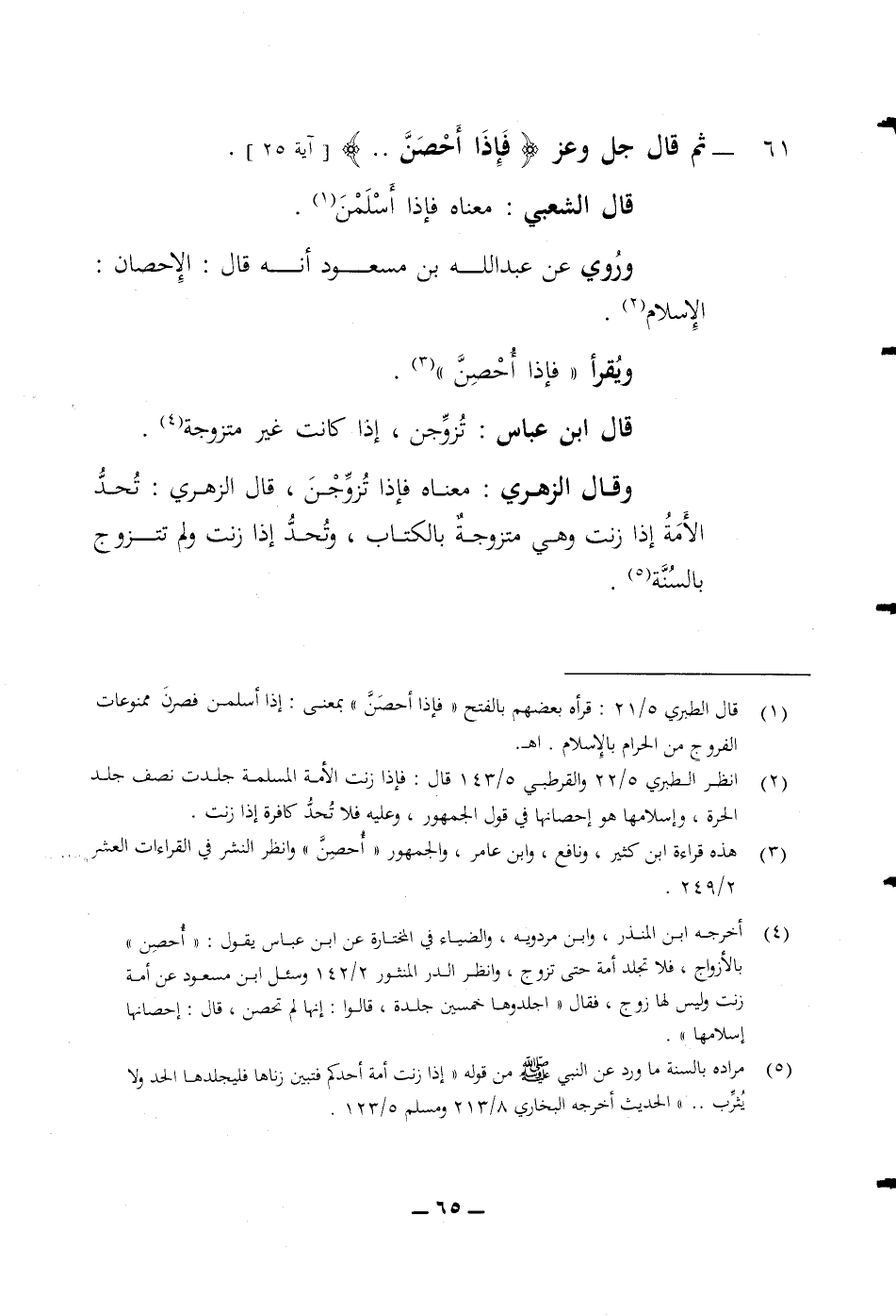 61 ثم قال جل وعز (فإذا أحصن) قال الشعبي معناه فإذا أسلمن وروي عن عبد الله بن مسعود أنه قال الاحصان الاسلام ويقرأ فإذا أحصن قال ابن عباس تزوجن إذا كانت غير متزوجة وقال الزهري معناه فإذا تزوجن قال الزهري تحد الامة إذا زنت وهي متزوجة بالكتاب وتحد إذا زنت ولم تتزوج بالسنة