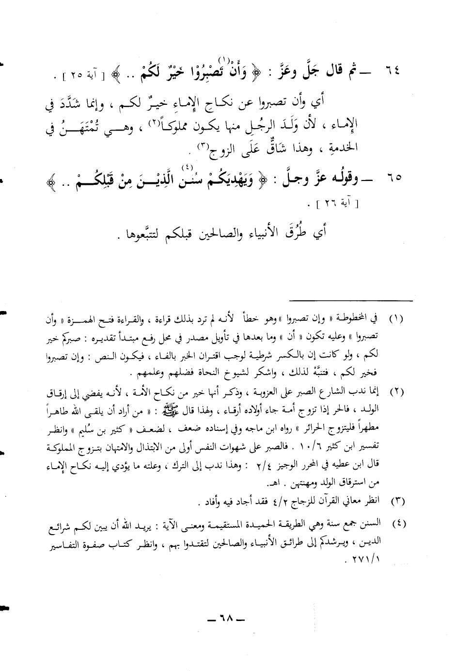 64 ثم قال جل وعز (وأن تصبروا خير لكم) أي وأن تصبروا عن نكاح الاماء خير لكم وانما شدد في الاماء لان ولد الرجل منها يكون مملوكا وهي تمتهن في الخدمة وهذا شاق على الزوج 65 وقوله عز وجل (ويهديكم سنن الذين من قبلكم) أي طرق الانبياء والصالحين قبلكم لتتبعوها)