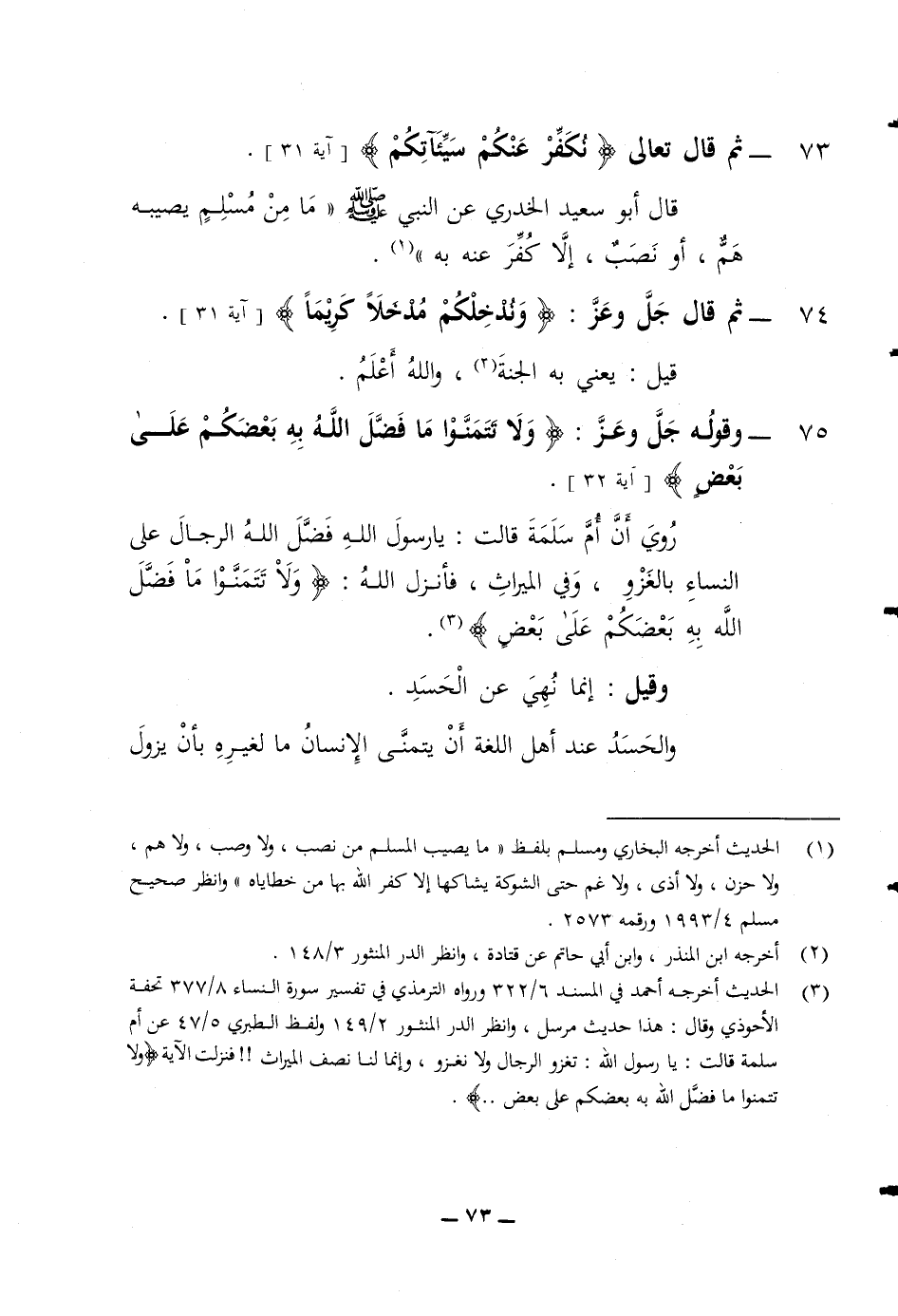 73 ثم قال تعالى (نكفر عنكم سيئاتكم) قال أبو سعيد الخدري عن النبي صلى الله عليه وسلم ما من مسلم يصيبه هم أو نصب الا كفر عنه به 74 ثم قال جل وعز (وندخلكم مدخلا كريما) قيل يعني به الجنة والله أعلم 75 وقوله جل وعز (ولا تتمنوا ما فضل الله به بعضكم على