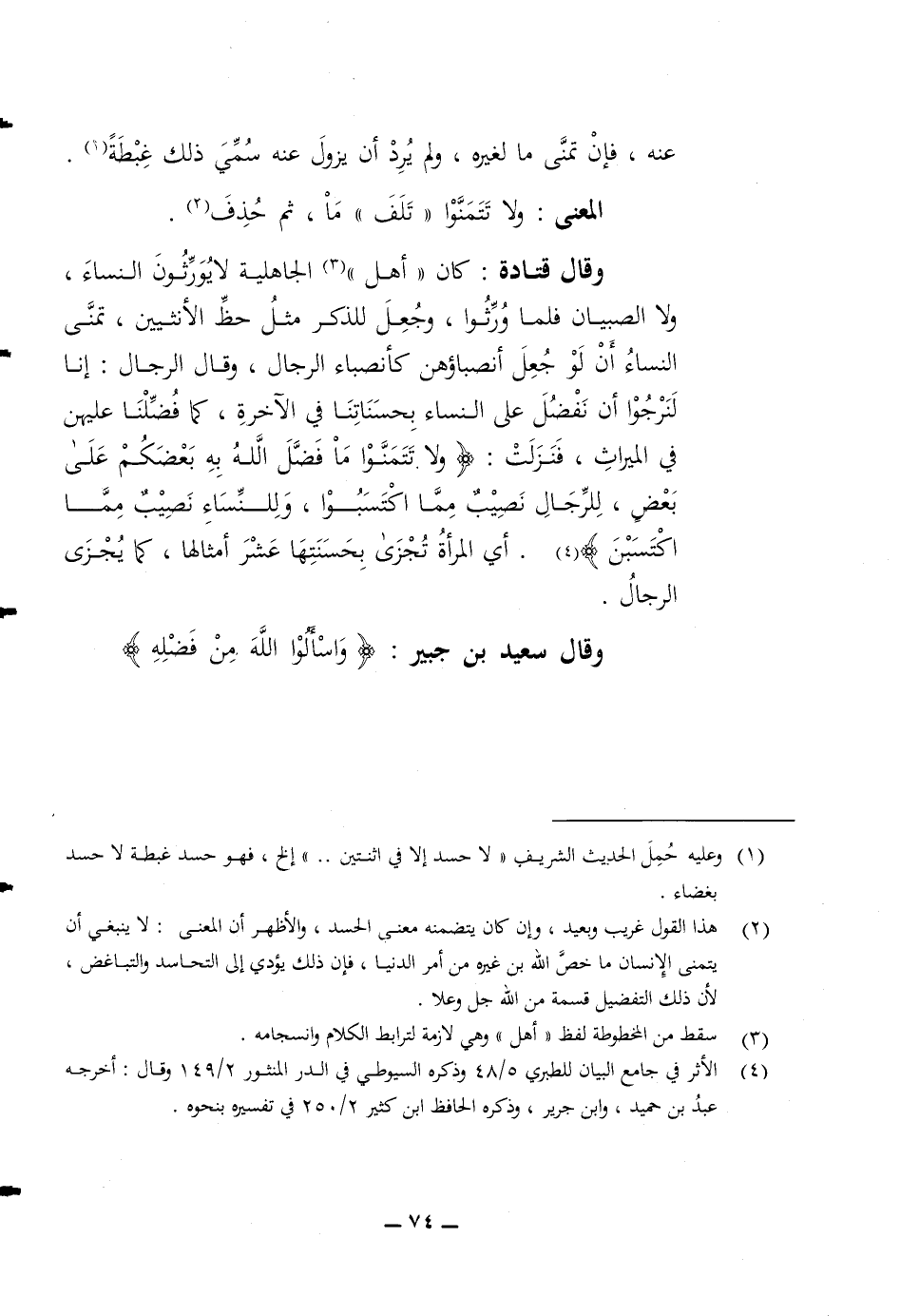 عنه فان تمنى ما لغيره ولم يرد أن يزول عنه سمي ذلك غبطة المعنى ولا تتمنوا تلف ما ثم حذف وقال قتادة كان أهل الجاهلية لا يورثون النساء ولا الصبيان فلما ورثوا وجعل للذكر مثل حظ الانثيين تمنى النساء أن لو جعل أنصباؤهن كأنصباء الرجال وقال الرجال انا لنرجوا أن نفضل على النساء بحسناتنا في الآخرة كما فضلنا عليهن في الميراث فنزلت (ولا تتمنوا ما فضل الله به بعضكم على بعض للرجال نصيب مما اكتسبوا وللنساء نصيب مما اكتسبن) أي المرأة تجزى بحسنتها عشر أمثالها كما يجزى الرجال وقال سعيد بن جبير (وأسألوا الله من فضله)