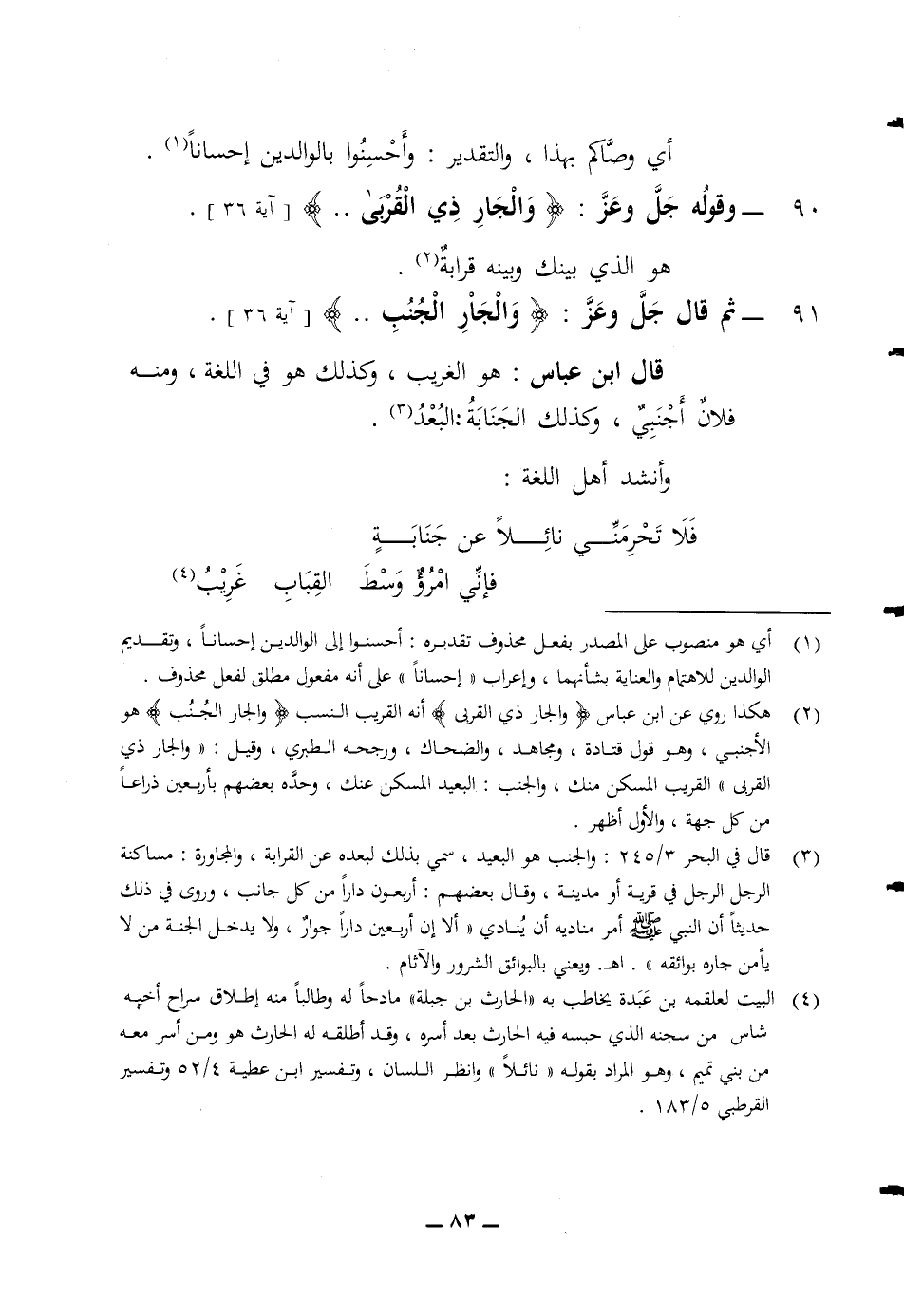 أي وصاكم بهذا والتقدير وأحسنوا بالوالدين احسانا 90 وقوله جل وعز (والجار ذي القربى) هو الذي بينك وبينه قرابة ثم قال جل وعز (والجار الجنب) قال ابن عباس هو الغريب وكذلك هو في اللغة ومنه فلان أجنبي وكذلك الجنابة البعد وأنشد أهل اللغة فلا تحرمني نائلا عن جنابة فاني امرؤ وسط القباب غريب