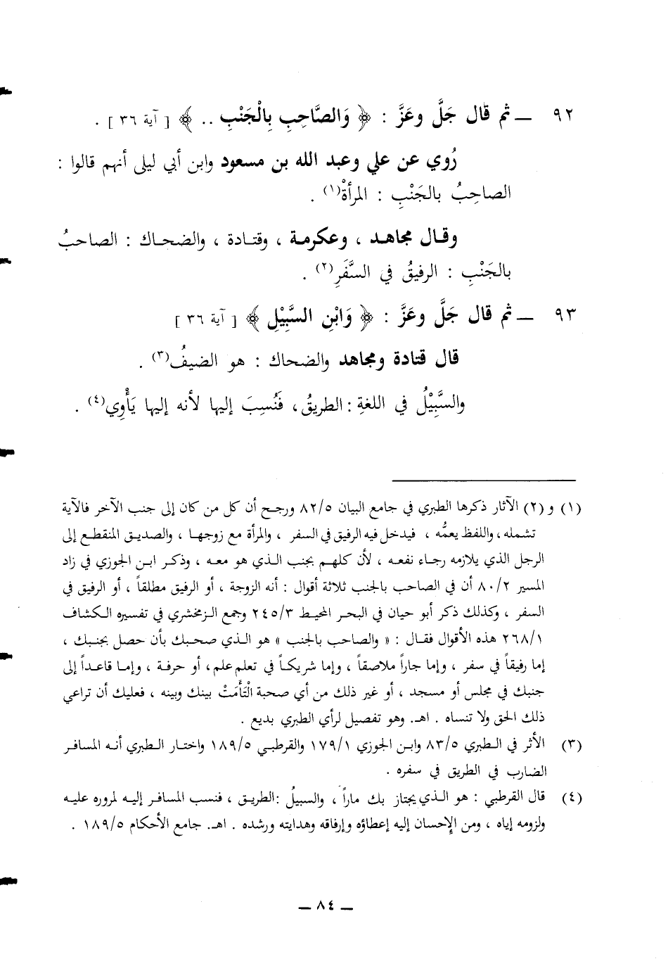 92 ثم قال جل وعز (والصاحب بالجنب) روي عن علي وعبد الله بن مسعود وابن أبي ليلى أنهم قالوا الصاحب بالجنب المرأة