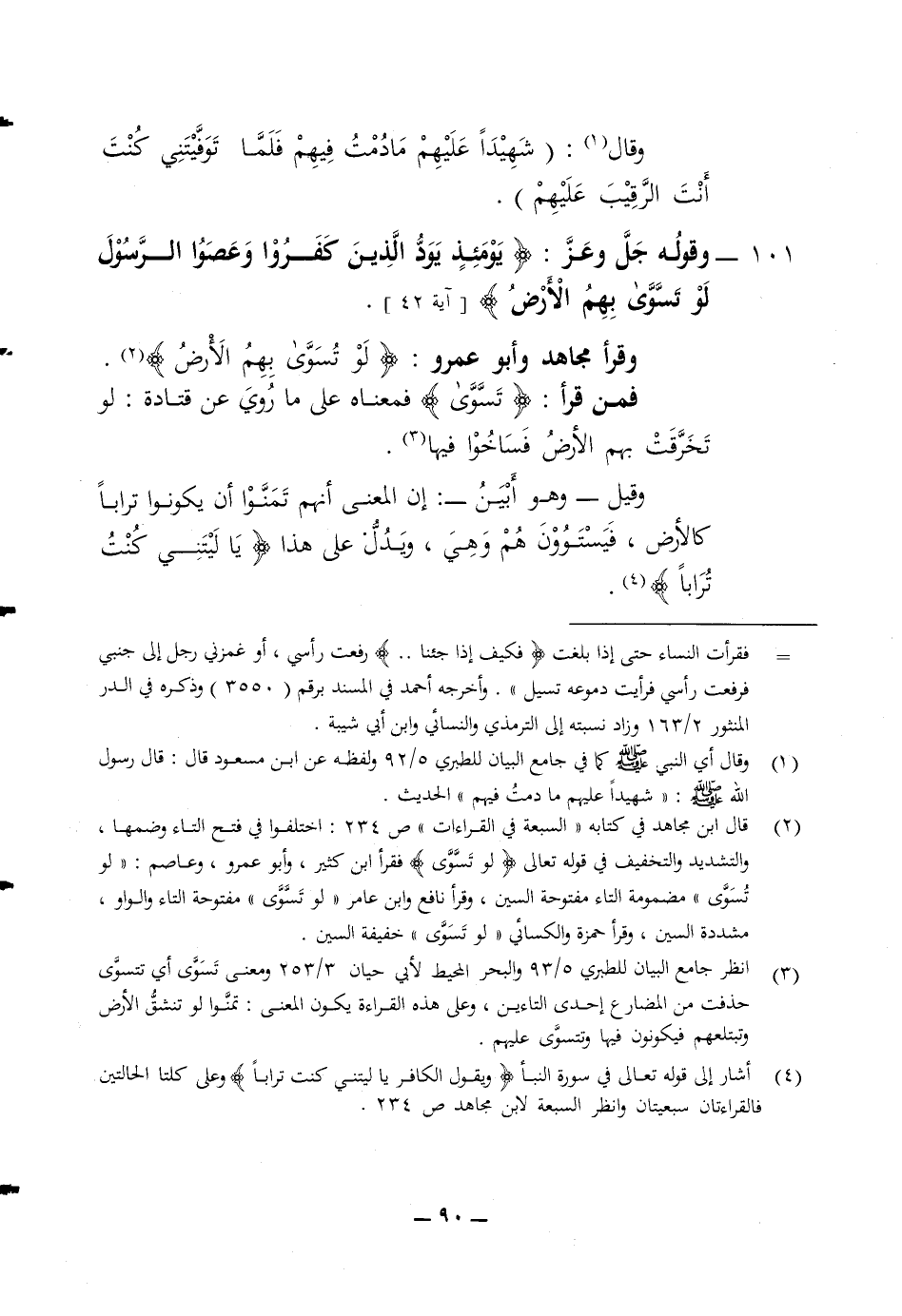 وقال شهيدا عليهم ما دمت فيهم فلما توفيتني كنت أنت الرقيب عليهم 101 وقوله جل وعز (يومئذ يود الذين كفروا وعصوا الرسول لو تسوى بهم الارض) وقرأ مجاهد وأبو عمرو لو تسوى بهم الارض فمن قرأ تسوى فمعناه على ما روي عن قتادة لو تخرقت بهم الارض فساخوا فيها وقيل وهو أبين ان المعنى أنهم تمنوا أن يكونوا ترابا كالارض فيستوون هم وهي ويدل على هذا (يا ليتني كنت ترابا)