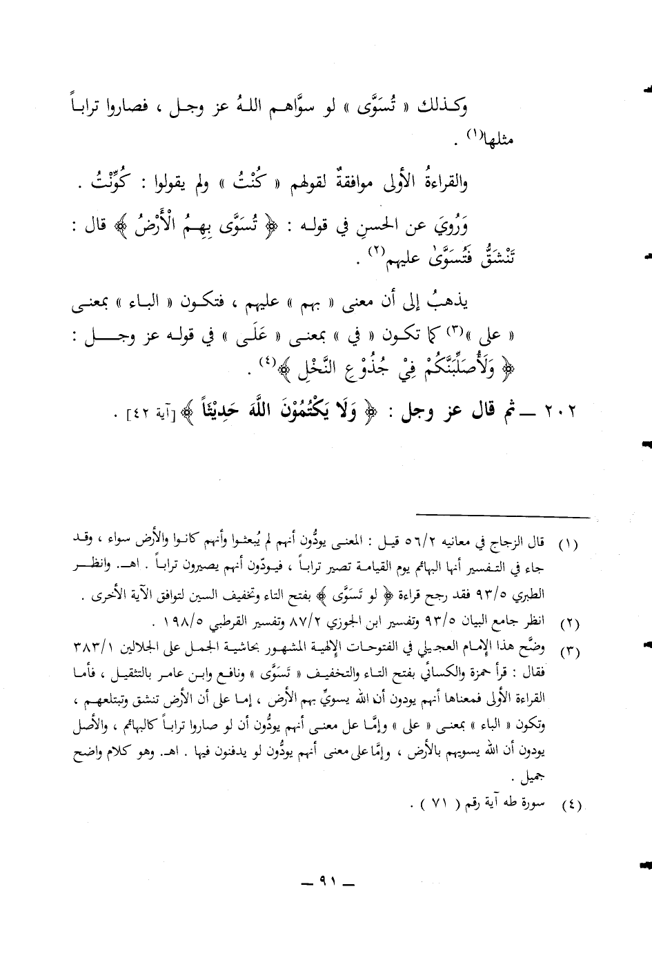 والقراءة الاولى موافقة لقولهم كنت ولم يقولوا كونت وروي عن الحسن في قوله تسوى بهم الارض قال تنشق فتسوى عليهم يذهب الى أن معنى (بهم) عليهم فتكون الباء بمعنى على كما تكون (في) بمعنى (على) في قوله عز وجل (ولأصلبنكم في جذوع النخل) 202 ثم قال عز وجل (ولا يكتمون الله حديثا)