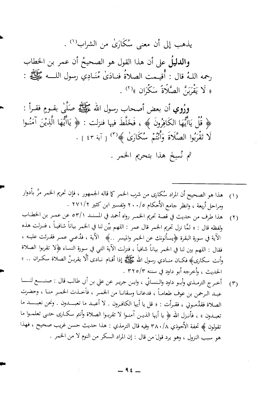 يذهب الى أن معنى سكارى من الشراب والدليل على أن هذا القول هو الصحيح أن عمر بن الخطاب رحمه الله قال أقيمت الصلاة فنادى منادي رسول الله صلى الله عليه وسلم (لا يقربن الصلاة سكران) وروي أن بعض أصحاب رسول الله صلى الله عليه وسلم صلى بقوم فقرأ (قل يا أيها الكافرون) فخلط فيها فنزلت (يا أيها الذين آمنوا لا تقربوا الصلاة وانتم سكارى) ثم نسخ هذا بتحريم الخمر