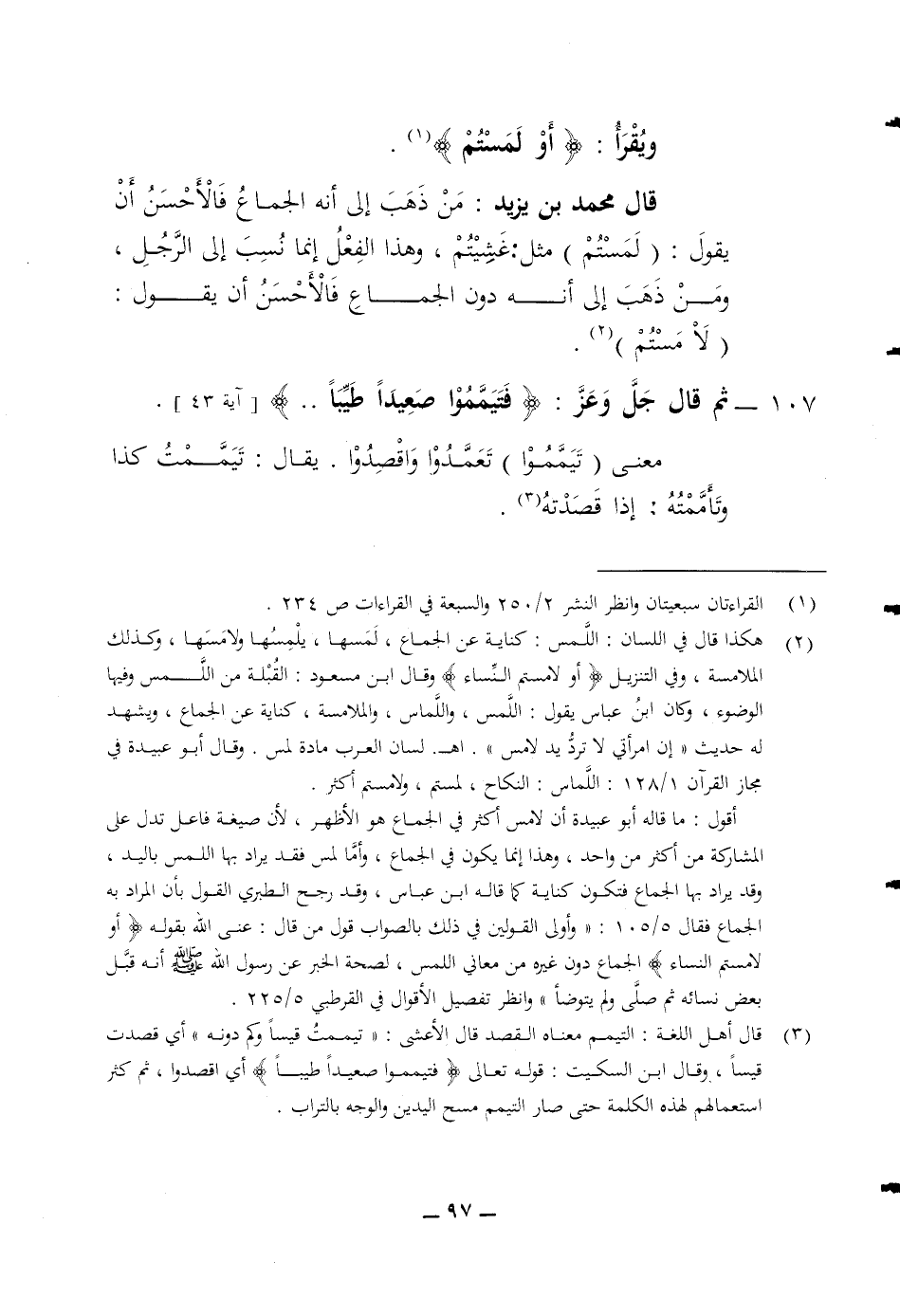 ويقرأ (أو لمستم) قال محمد بن يزيد من ذهب الى أنه الجماع فالاحسن أن يقول لمستم مثل غشيتم وهذا الفعل انما نسب الى الرجل ومن ذهب الى أنه دون الجماع فالاحسن أن يقول لامستم 107 ثم قال جل وعز (فتيمموا صعيدا طيبا) معنى تيمموا تعمدوا واقصدوا يقال تيممت كذا وتأممته إذا قصدته