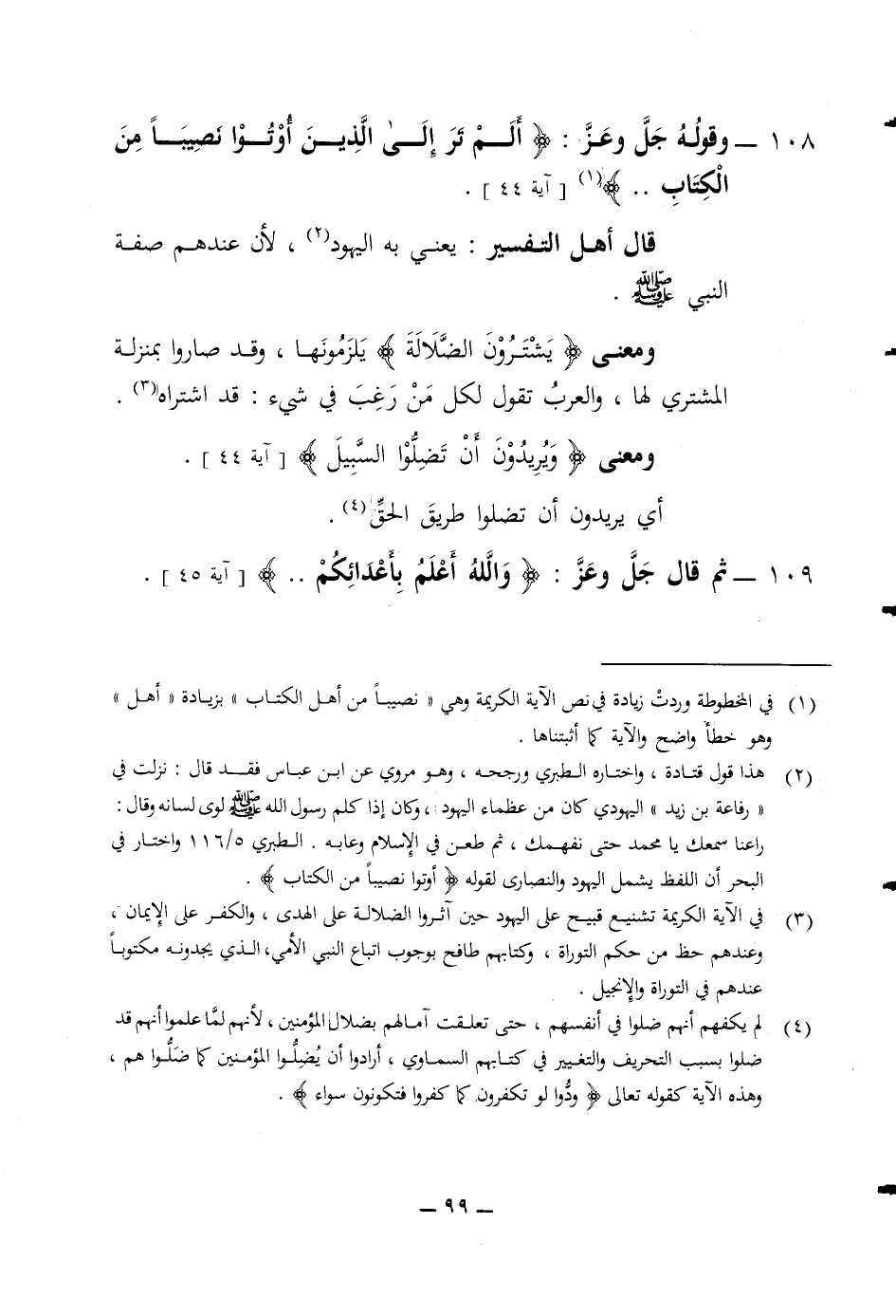 108 وقوله جل وعز (ألم تر الى الذين أوتوا نصيبا من الكتاب) قال أهل التفسير يعني به اليهود لان عندهم صفة النبي صلى الله عليه وسلم ومعنى (يشترون الضلالة) يلزمونها وقد صاروا بمنزلة المشتري لها والعرب تقول لكل من رغب في شئ قد اشتراه ومعنى (ويريدون أن تضلوا السبيل) أي يريدون أن تضلوا طريق الحق 109 ثم قال جل وعز (والله أعلم بأعدائكم)