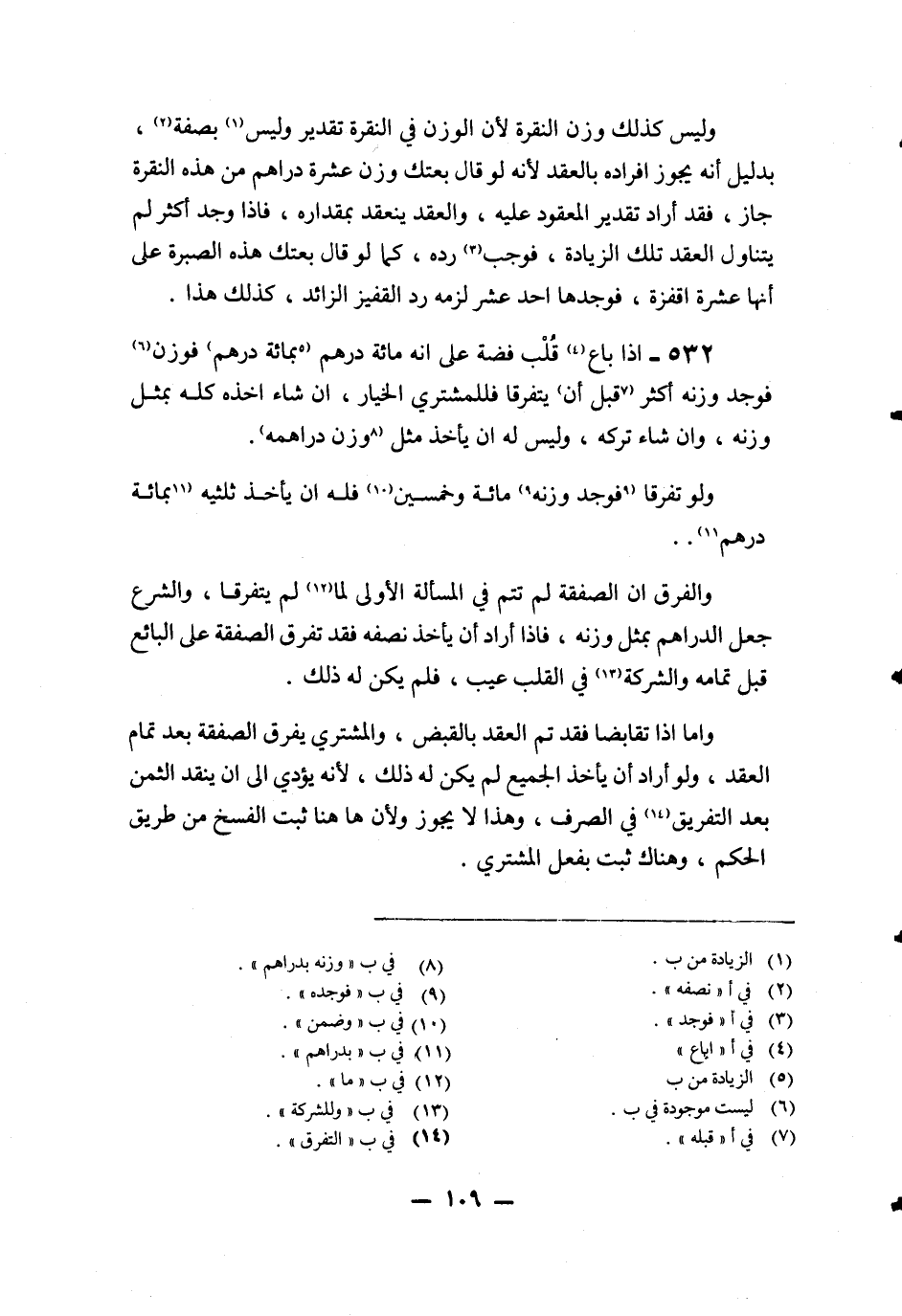 532 - إذَا بَاعَ قَلْبَ فِضَّةٍ عَلَى أَنَّهُ مِائَةُ دِرْهَمٍ بِمِائَةِ دِرْهَمٍ فَوَزَنَ فَوَجَدَ وَزْنَهُ أَكْثَرَ قَبْلَ أَنْ يَتَفَرَّقَا فَلِلْمُشْتَرِي الْخِيَارُ، إنْ شَاءَ أَخَذَهُ كُلَّهُ بِمِثْلِ وَزْنِهِ، وَإِنْ شَاءَ تَرَكَهُ، وَلَيْسَ لَهُ أَنْ يَأْخُذَ مِثْلَ وَزْنِ دَرَاهِمِهِ.