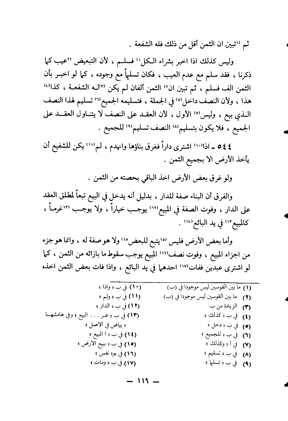 544 - إذَا اشْتَرَى دَارًا فَغَرِقَ بِنَاؤُهَا وَانْهَدَمَ، لَمْ يَكُنْ لِلشَّفِيعِ أَنْ يَأْخُذَ الْأَرْضَ إلَّا بِجَمِيعِ الثَّمَنِ. وَلَوْ غَرِقَ بَعْضُ الْأَرْضِ أَخَذَ الْبَاقِيَ بِحِصَّتِهِ مِنْ الثَّمَنِ. وَالْفَرْقُ أَنَّ الْبِنَاءَ صِفَةٌ لِلدَّارِ، بِدَلِيلِ أَنَّهُ يَدْخُلُ فِي الْبَيْعِ تَبَعًا لِمُطْلَقِ الْعَقْدِ عَلَى الدَّارِ، وَفَوْتُ الصِّفَةِ فِي الْمَبِيعِ يُوجِبُ خِيَارًا، وَلَا يُوجِبُ غُرْمًا، كَالْمَبِيعِ فِي يَدِ الْبَائِعِ. وَأَمَّا بَعْضُ الْأَرْضِ فَلَيْسَ يَتْبَعُ لِلْبَعْضِ وَلَا هُوَ صِفَةٌ لَهُ، وَإِنَّمَا هُوَ جُزْءٌ مِنْ أَجْزَاءِ الْمَبِيعِ، وَفَوْتُ نِصْفِ الْمَبِيعِ يُوجِبُ سُقُوطَ مَا بِإِزَائِهِ مِنْ الثَّمَنِ، كَمَا لَوْ اشْتَرَى عَبْدَيْنِ فَفَاتِ أَحَدُهُمَا فِي يَدِ الْبَائِعِ، وَإِذَا فَاتَ بَعْضُ الثَّمَنِ أَخَذَهُ