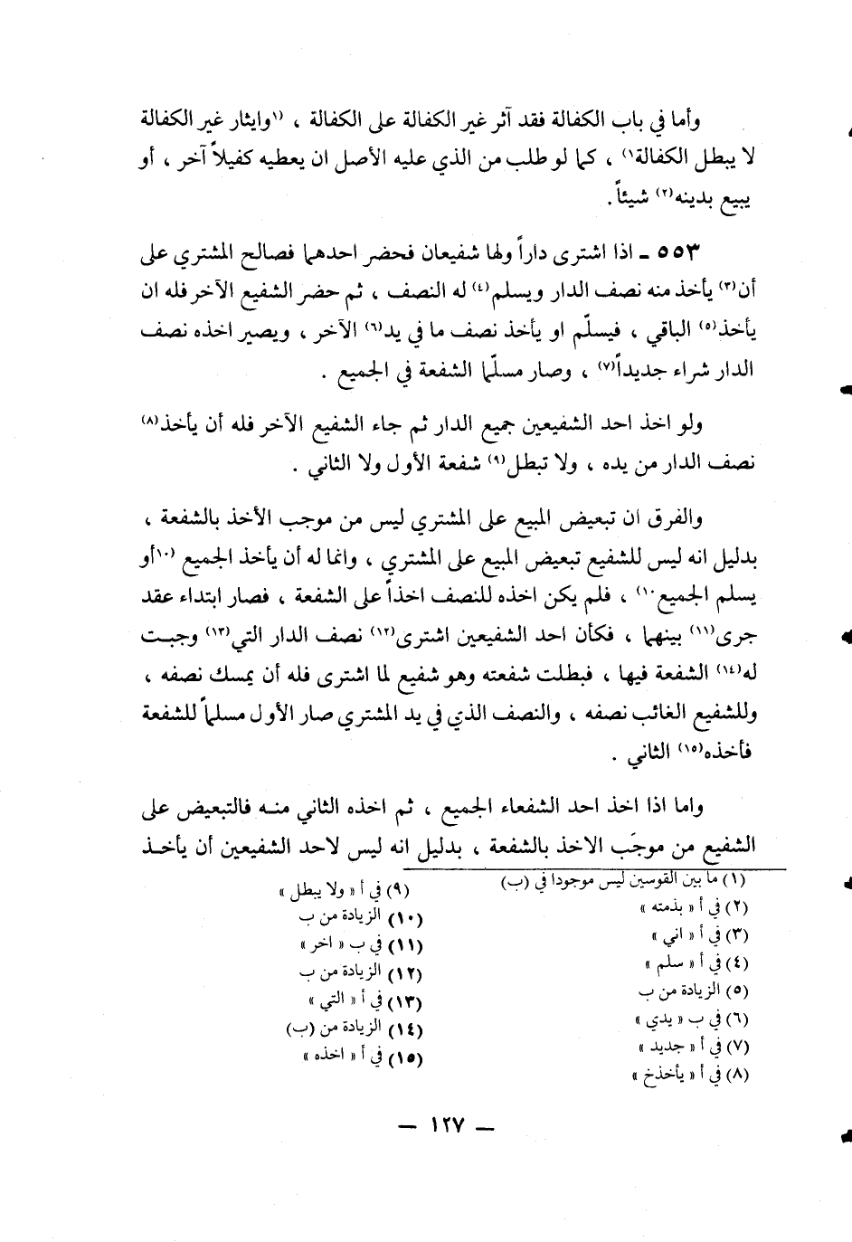 553 - إذَا اشْتَرَى دَارًا وَلَهَا شَفِيعَانِ فَحَضَرَ أَحَدُهُمَا فَصَالَحَ الْمُشْتَرِي عَلَى أَنْ يَأْخُذَ مِنْهُ نِصْفَ الدَّارِ وَيُسَلِّمَ لَهُ النِّصْفَ، ثُمَّ حَضَرَ الشَّفِيعُ الْآخَرُ فَلَهُ أَنْ يَأْخُذَ الْبَاقِيَ، فَيُسَلِّمَ أَوْ يَأْخُذَ نِصْفَ مَا فِي يَدِ الْآخَرِ، وَيَصِيرُ أَخْذُهُ نِصْفَ الدَّارِ شِرَاءً جَدِيدًا، وَصَارَ مُسَلِّمًا الشُّفْعَةَ فِي الْجَمِيعِ. وَلَوْ أَخَذَ أَحَدُ الشَّفِيعَيْنِ جَمِيعَ الدَّارِ ثُمَّ جَاءَ الشَّفِيعُ الْآخَرُ فَلَهُ أَنْ يَأْخُذَ نِصْفَ الدَّارِ مِنْ يَدِهِ، وَلَا تَبْطُلُ شُفْعَةُ الْأَوَّلِ وَلَا الثَّانِي. وَالْفَرْقُ أَنَّ تَبْعِيضَ الْمَبِيعِ عَلَى الْمُشْتَرِي لَيْسَ مِنْ مُوجَبِ الْأَخْذِ بِالشُّفْعَةِ، بِدَلِيلِ أَنَّهُ لَيْسَ لِلشَّفِيعِ تَبْعِيضُ الْمَبِيعِ عَلَى الْمُشْتَرِي، وَإِنَّمَا أَنْ يَأْخُذَ الْجَمِيعَ أَوْ يُسَلِّمَ الْجَمِيعَ، فَلَمْ يَكُنْ أَخْذُهُ لِلنِّصْفِ أَخْذًا عَلَى الشُّفْعَةِ، فَصَارَ ابْتِدَاءَ عَقْدٍ جَرَى بَيْنَهُمَا، فَكَأَنَّ أَحَدَ الشَّفِيعَيْنِ اشْتَرَى نِصْفَ الدَّارِ الَّتِي وَجَبَتْ لَهُ الشُّفْعَةُ فِيهَا، فَبَطَلَتْ شُفْعَتُهُ وَهُوَ شَفِيعٌ لِمَا اشْتَرَى فَلَهُ أَنْ يُمْسِكَ نِصْفَهُ، وَلِلشَّفِيعِ الْغَائِبِ نِصْفُهُ، وَالنِّصْفُ الَّذِي فِي يَدِ الْمُشْتَرِي صَارَ الْأَوَّلُ مُسَلَّمًا لِلشُّفْعَةِ فَأَخَذَهُ الثَّانِي. وَأَمَّا إذَا أَخَذَ أَحَدُ الشُّفَعَاءِ الْجَمِيعَ، ثُمَّ أَخَذَهُ الثَّانِي مِنْهُ فَالتَّبْعِيضُ عَلَى الشَّفِيعِ مِنْ مُوجَبِ الْأَخْذِ بِالشُّفْعَةِ، بِدَلِيلِ أَنَّهُ لَيْسَ لِأَحَدِ الشَّفِيعَيْنِ أَنْ يَأْخُذَ