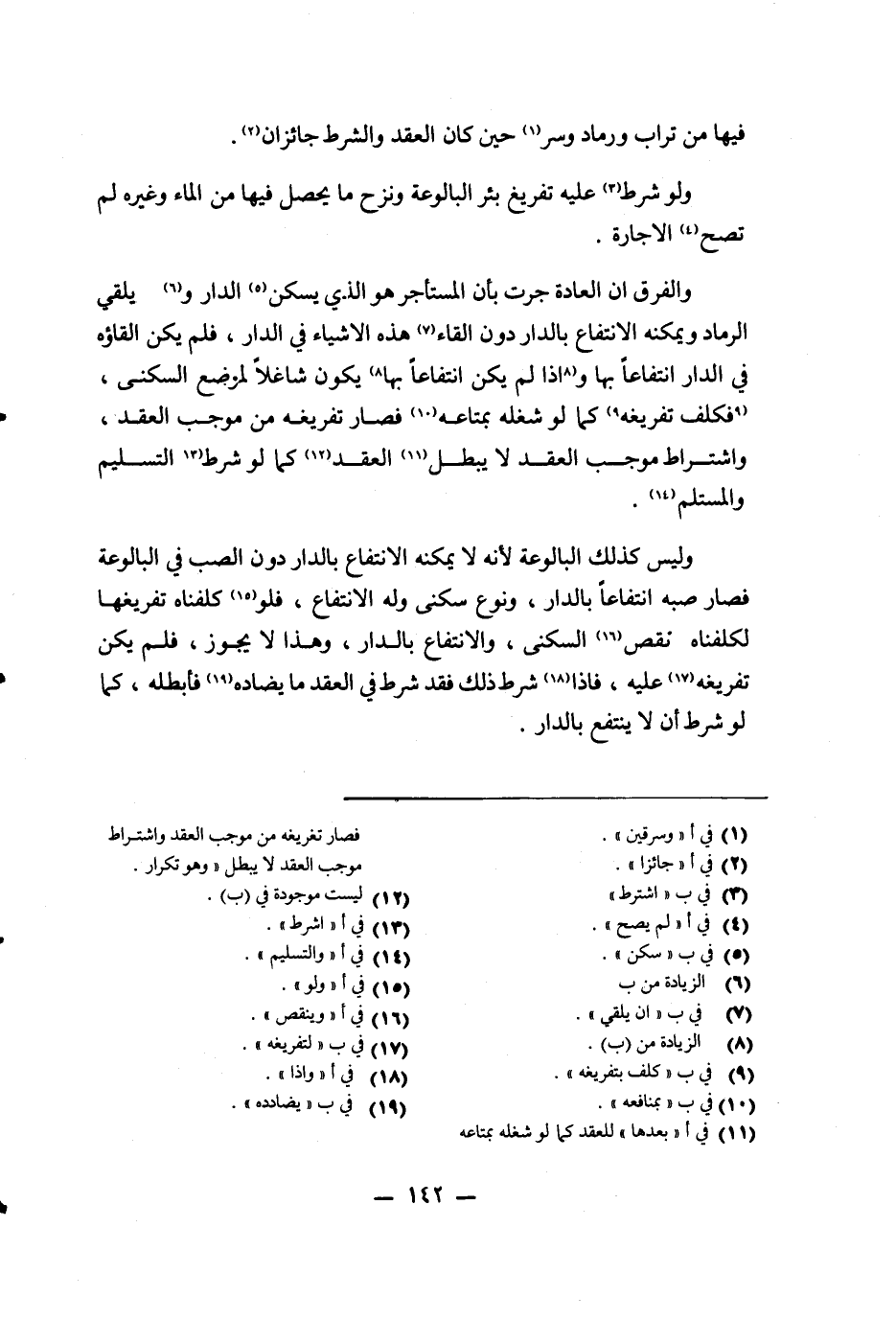 فِيهَا مِنْ تُرَابٍ وَرَمَادٍ وَسِرْقِينٍ كَانَ الْعَقْدُ وَالشَّرْطُ جَائِزَيْنِ. وَلَوْ شَرَطَ عَلَيْهِ تَفْرِيغَ بِئْرِ الْبَالُوعَةِ وَنَزْحَ مَا يَحْصُلُ فِيهَا مِنْ الْمَاءِ وَغَيْرِهِ لَمْ تَصِحَّ الْإِجَارَةُ. وَالْفَرْقُ أَنَّ الْعَادَةَ جَرَتْ بِأَنَّ الْمُسْتَأْجِرَ هُوَ الَّذِي يَسْكُنُ الدَّارَ وَيُلْقِي الرَّمَادَ وَيُمْكِنُهُ الِانْتِفَاعُ بِالدَّارِ دُونَ إلْقَاءِ هَذِهِ الْأَشْيَاءِ فِي الدَّارِ، فَلَمْ يَكُنْ إلْقَاؤُهُ فِي الدَّارِ انْتِفَاعًا بِهَا وَإِذَا لَمْ يَكُنْ انْتِفَاعًا بِهَا يَكُونُ شَاغِلًا لِمَوْضِعِ السُّكْنَى، فَكُلِّفَ تَفْرِيغَهُ كَمَا لَوْ شَغَلَهُ بِمَتَاعِهِ فَصَارَ تَفْرِيغُهُ مِنْ مُوجَبِ الْعَقْدِ، وَاشْتِرَاطُ مُوجَبِ الْعَقْدِ لَا يُبْطِلُ الْعَقْدَ كَمَا لَوْ شَرَطَ التَّسْلِيمَ وَالْمُسْتَلِمَ. وَلَيْسَ كَذَلِكَ الْبَالُوعَةُ لِأَنَّهُ لَا يُمْكِنُهُ الِانْتِفَاعُ بِالدَّارِ دُونَ الصَّبِّ فِي الْبَالُوعَةِ فَصَارَ صَبُّهُ انْتِفَاعًا بِالدَّارِ، وَنَوْعَ سُكْنَى وَلَهُ الِانْتِفَاعُ، فَلَوْ كَلَّفْنَاهُ تَفْرِيغَهَا لَكَلَّفْنَاهُ نَقْصَ السُّكْنَى، وَالِانْتِفَاعَ بِالدَّارِ، وَهَذَا لَا يَجُوزُ، فَلَمْ يَكُنْ تَفْرِيغُهُ عَلَيْهِ، فَإِذَا شَرَطَ ذَلِكَ فَقَدْ شَرَطَ فِي الْعَقْدِ مَا يُضَادُّهُ، فَأَبْطَلَهُ، كَمَا لَوْ شَرَطَ أَنْ لَا يَنْتَفِعَ بِالدَّارِ.