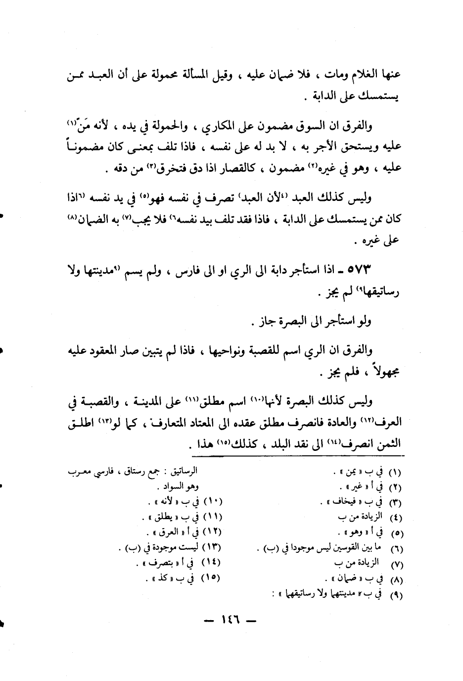 573 - إذَا اسْتَأْجَرَ دَابَّةً إلَى الرَّيِّ أَوْ إلَى فَارِسَ، وَلَمْ يُسَمِّ مَدِينَتَهَا وَلَا رَسَاتِيقَهُ الْبَصْرَةِ جَازَ. وَالْفَرْقُ أَنَّ الرَّيَّ اسْمٌ لِلْقَصَبَةِ وَنَوَاحِيهَا، فَإِذَا لَمْ يَتَبَيَّنْ صَارَ الْمَعْقُودُ عَلَيْهِ مَجْهُولًا، فَلَمْ يَجُزْ. وَلَيْسَ كَذَلِكَ الْبَصْرَةَ لِأَنَّهَا اسْمٌ مُطْلَقٌ عَلَى الْمَدِينَةِ، وَالْقَصَبَةُ فِي الْعُرْفِ وَالْعَادَةِ فَانْصَرَفَ مُطْلَقُ عَقْدِهِ إلَى الْمُعْتَادِ الْمُتَعَارَفِ، كَمَا لَوْ أَطْلَقَ الثَّمَنَ انْصَرَفَ إلَى نَقْدِ الْبَلَدِ، كَذَلِكَ هَذَا.
