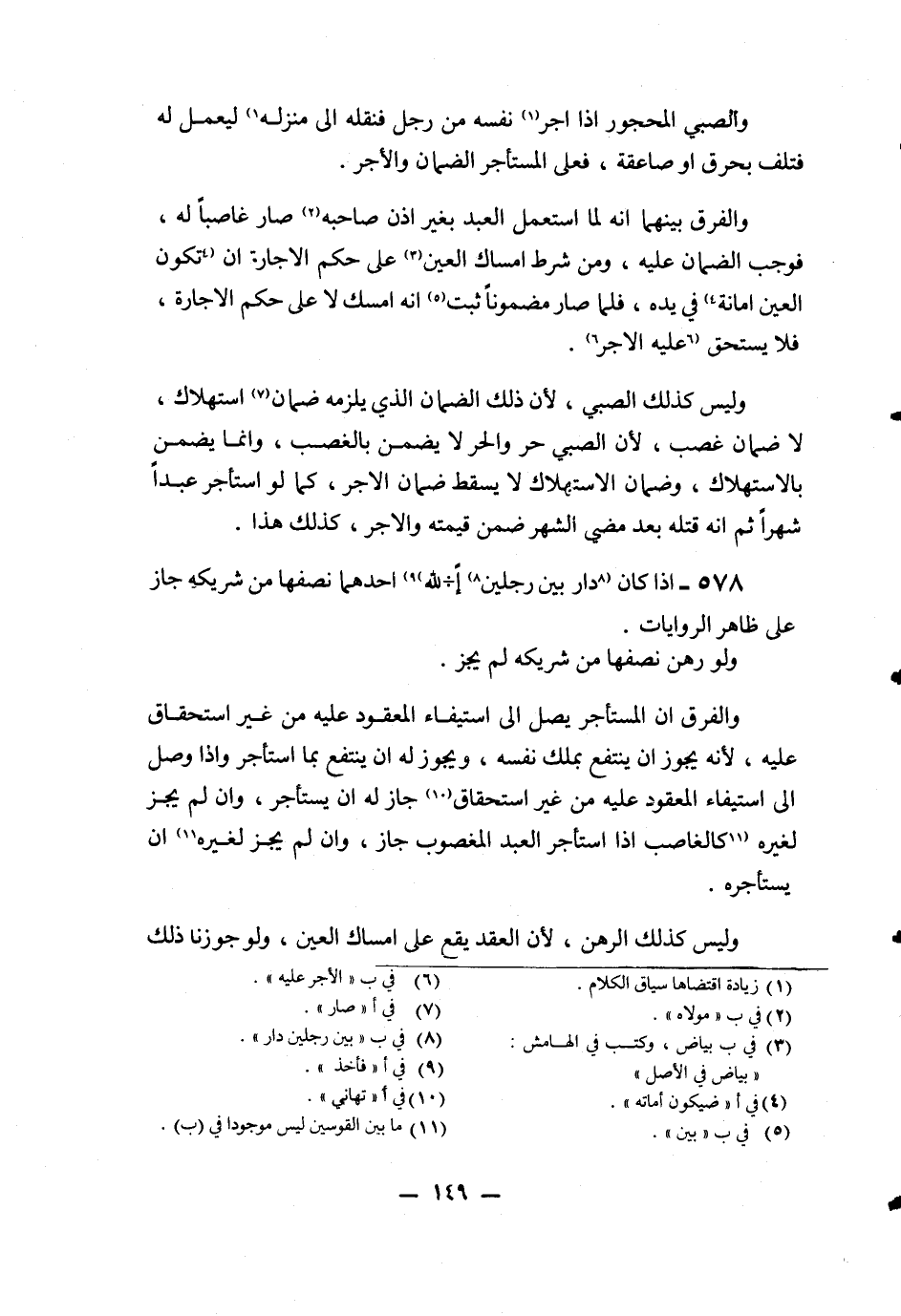 875 - إذَا كَانَ دَارٌ بَيْنَ رَجُلَيْنِ فَاسْتَأْجَرَ أَحَدُهُمَا نِصْفَهَا مِنْ شَرِيكِهِ جَازَ عَلَى ظَاهِرِ الرِّوَايَاتِ. وَلَوْ رَهَنَ نِصْفَهَا مِنْ شَرِيكِهِ لَمْ يَجُزْ. وَالْفَرْقُ أَنَّ الْمُسْتَأْجِرِ يَصِلُ إلَى اسْتِيفَاءِ الْمَعْقُودِ عَلَيْهِ مِنْ غَيْرِ اسْتِحْقَاقٍ عَلَيْهِ، لِأَنَّهُ يَجُوزُ أَنْ يَنْتَفِعَ بِمِلْكِ نَفْسِهِ، وَيَجُوزُ لَهُ أَنْ يَنْتَفِعَ بِمَا اسْتَأْجَرَ وَإِذَا وَصَلَ إلَى الِاسْتِيفَاءِ الْمَعْقُودِ عَلَيْهِ مِنْ غَيْرِ اسْتِحْقَاقٍ جَازَ لَهُ أَنْ يَسْتَأْجِرَ، وَإِنْ لَمْ يَجُزْ لِغَيْرِهِ، كَالْغَاصِبِ إذَا اسْتَأْجَرَ الْعَبْدَ الْمَغْصُوبَ جَازَ، وَإِنْ لَمْ يَجُزْ لِغَيْرِهِ أَنْ يَسْتَأْجِرَهُ. وَلَيْسَ كَذَلِكَ الرَّهْنُ، لِأَنَّ الْعَقْدَ يَقَعُ عَلَى إمْسَاكِ الْعَيْنِ، وَلَوْ جَوَّزْنَا ذَلِكَ