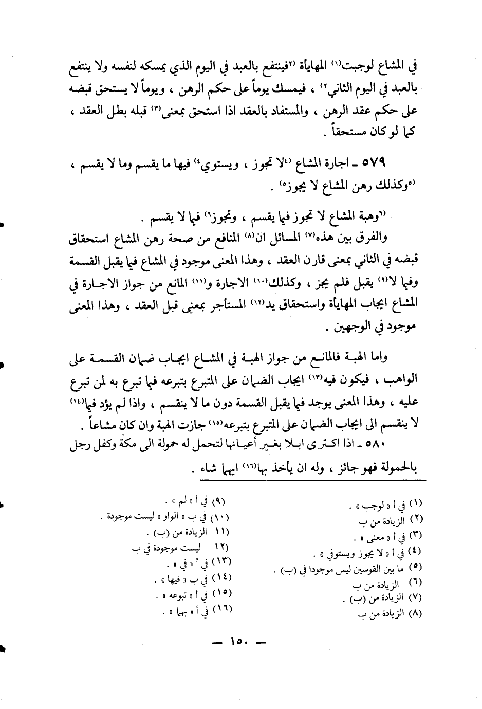 579 - إجَارَةَ الْمُشَاعِ لَا تَجُوزُ، وَيَسْتَوِي فِيهَا مَا يُقْسَمُ وَمَا لَا يُقْسَمُ، وَكَذَلِكَ رَهْنُ الْمُشَاعِ لَا يَجُوزُ. وَهِبَةُ الْمُشَاعِ لَا تَجُوزُ فِيمَا يُقْسَمُ، وَتَجُوزُ فِيمَا لَا يُقْسَمُ. وَالْفَرْقُ بَيْنَ هَذِهِ الْمَسَائِلِ أَنَّ الْمَنَافِعَ مِنْ صِحَّةِ رَهْنِ الْمُشَاعِ اسْتِحْقَاقُ قَبْضِهِ فِي الثَّانِي بِمَعْنًى قَارَنَ الْعَقْدَ، وَهَذَا الْمَعْنَى مَوْجُودٌ فِي الْمُشَاعِ فِيمَا يَقْبَلُ الْقِسْمَةَ وَفِيمَا لَا يَقْبَلُ فَلَمْ يَجُزْ، وَكَذَلِكَ الْإِجَارَةُ وَالْمَانِعُ مِنْ جَوَازِ الْإِجَارَةِ فِي الْمُشَاعِ إيجَابُ الْمُهَايَأَةِ وَاسْتِحْقَاقُ يَدِ الْمُسْتَأْجِرِ بِمَعْنًى قَبْلَ الْعَقْدِ، وَهَذَا الْمَعْنَى مَوْجُودٌ فِي الْوَجْهَيْنِ. وَأَمَّا الْهِبَةُ فَالْمَانِعُ مِنْ جَوَازِ الْهِبَةِ فِي الْمُشَاعِ إيجَابُ ضَمَانِ الْقِسْمَةِ عَلَى الْوَاهِبِ، فَيَكُونُ فِيهِ إيجَابُ الضَّمَانِ عَلَى الْمُتَبَرِّعِ بِتَبَرُّعِهِ فِيمَا تَبَرَّعَ بِهِ لِمَنْ تَبَرَّعَ عَلَيْهِ، وَهَذَا الْمَعْنَى يُوجَدُ فِيمَا يَقْبَلُ الْقِسْمَةَ دُونَ مَا لَا يَنْقَسِمُ، وَإِذَا لَمْ يُؤَدِّ فِيمَا لَا يَنْقَسِمُ إلَى إيجَابِ الضَّمَانِ عَلَى الْمُتَبَرِّعِ بِتَبَرُّعِهِ جَازَتْ الْهِبَةُ وَإِنْ كَانَ مُشَاعًا.