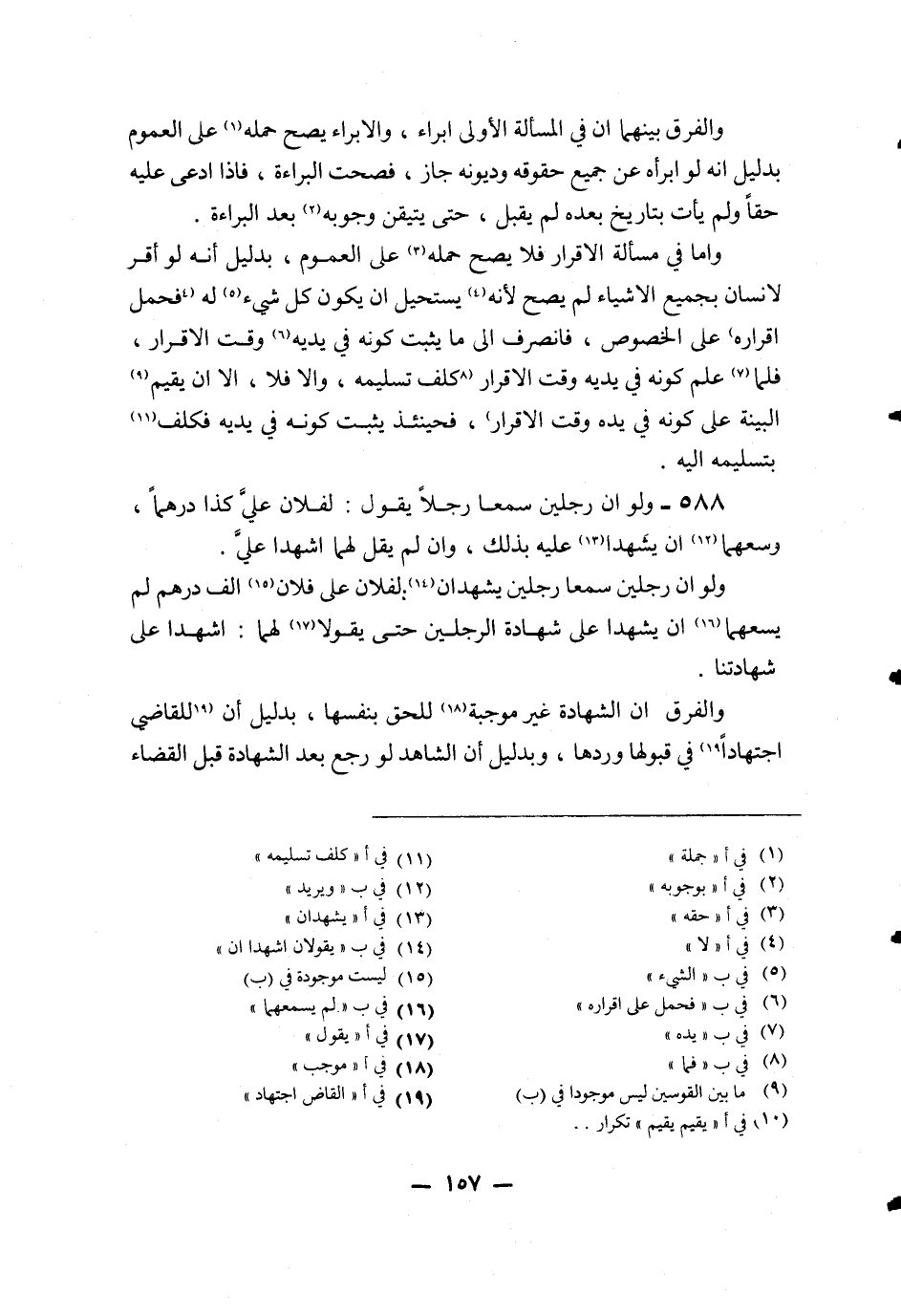 588 - وَلَوْ أَنَّ رَجُلَيْنِ سَمِعَا رَجُلًا يَقُولُ: لِفُلَانٍ عَلَيَّ كَذَا دِرْهَمًا، وَسِعَهُمَا أَنْ يَشْهَدَا عَلَيْهِ بِذَلِكَ، وَإِنْ لَمْ يَقُلْ لَهُمَا اشْهَدَا عَلَيَّ. وَلَوْ أَنَّ رَجُلَيْنِ سَمِعَا رَجُلَيْنِ يَشْهَدَانِ لِفُلَانٍ عَلَى فُلَانٍ أَلْفُ دِرْهَمٍ لَمْ يَسَعْهُمَا أَنْ يَشْهَدَا عَلَى شَهَادَةِ الرَّجُلَيْنِ حَتَّى يَقُولَا لَهُمَا: اشْهَدَا عَلَى شَهَادَتِنَا. وَالْفَرْقُ أَنَّ الشَّهَادَةَ غَيْرُ مُوجِبَةٍ لِلْحَقِّ بِنَفْسِهَا بِدَلِيلِ أَنَّ لِلْقَاضِي اجْتِهَادًا فِي قَبُولِهَا وَرَدِّهَا، وَبِدَلِيلِ أَنَّ الشَّاهِدَ لَوْ رَجَعَ بَعْدَ الشَّهَادَةِ قَبْلَ الْقَضَاءِ