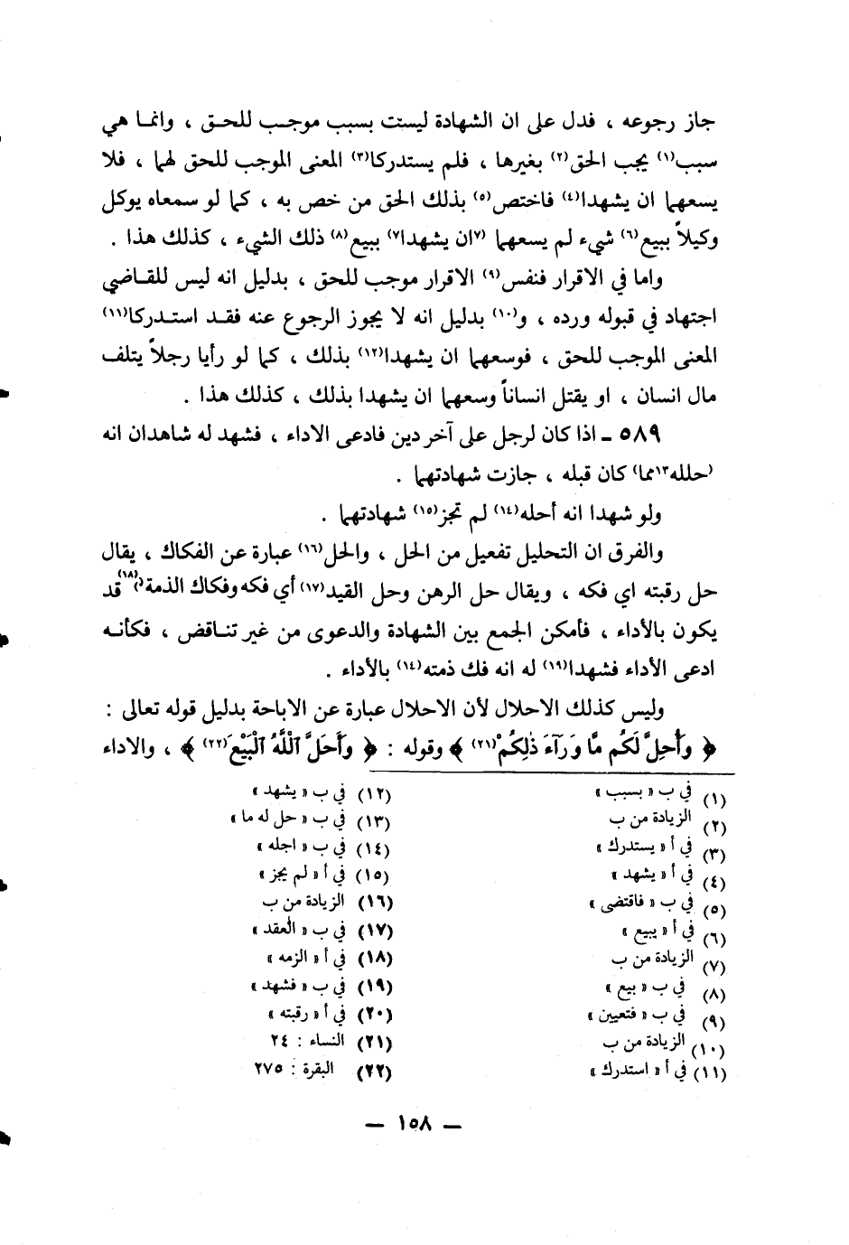 589 - إذَا كَانَ لِرَجُلٍ عَلَى آخَرَ دَيْنٌ فَادَّعَى الْأَدَاءَ، فَشَهِدَ لَهُ شَاهِدَانِ أَنَّهُ حَلَّلَهُ مِمَّا كَانَ قَبْلَهُ، جَازَتْ شَهَادَتُهُمَا. وَلَوْ شَهِدَا أَنَّهُ أَحَلَّهُ لَمْ تَجُزْ شَهَادَتُهُمَا. وَالْفَرْقُ أَنَّ التَّحْلِيلَ تَفْعِيلٌ مِنْ الْحِلِّ، وَالْحِلُّ عِبَارَةٌ عَنْ الْفِكَاكِ، يُقَالُ حَلَّ رَقَبَتَهُ أَيْ فَكَّهُ، وَيُقَالُ حَلَّ الرَّهْنَ وَحَلَّ الْقَيْدَ، أَيْ فَكَّهُ وَفِكَاكُ الذِّمَّةِ قَدْ يَكُونُ بِالْأَدَاءِ، فَأَمْكَنَ الْجَمْعُ بَيْنَ الشَّهَادَةِ وَالدَّعْوَى مِنْ غَيْرِ تَنَاقُضٍ، فَكَأَنَّهُ ادَّعَى الْأَدَاءَ فَشَهِدَا لَهُ أَنَّهُ فَكَّ ذِمَّتَهُ بِالْأَدَاءِ. وَلَيْسَ كَذَلِكَ الْإِحْلَالُ لِأَنَّ الْإِحْلَالَ عِبَارَةٌ عَنْ الْإِبَاحَةِ بِدَلِيلِ قَوْله تَعَالَى: {وَأُحِلَّ لَكُمْ مَا وَرَاءَ ذَلِكُمْ} [النساء: 24] وَقَوْلِهِ: {وَأَحَلَّ اللَّهُ الْبَيْعَ} [البقرة: 275] ، وَالْأَدَاءُ