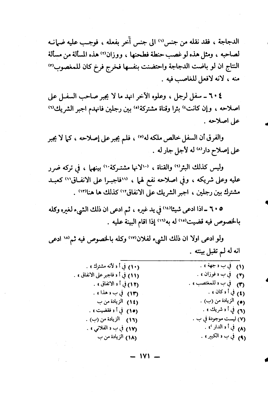 604 - سُفْلٌ لِرَجُلٍ، وَعُلْوُهُ لِآخَرَ انْهَدَمَا لَا يُجْبَرُ صَاحِبُ السُّفْلِ عَلَى إصْلَاحِهِ، وَإِنْ كَانَتْ بِئْرًا وَقَنَاةً مُشْتَرَكَةً بَيْنَ رَجُلَيْنِ فَانْهَدَمَ أُجْبِرَ الشَّرِيكُ عَلَى إصْلَاحِهِ
