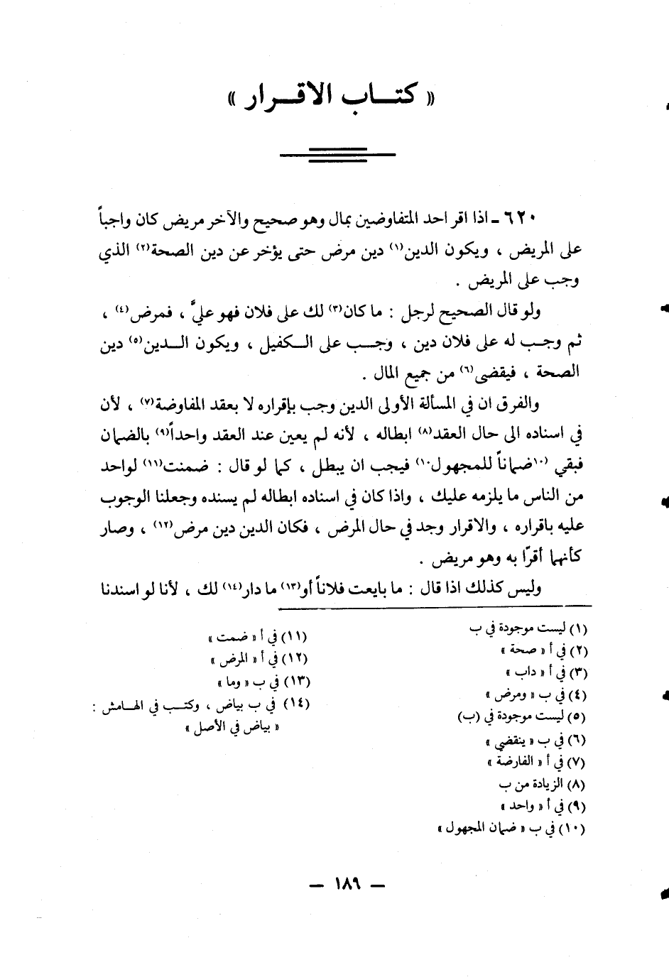 620 - إذَا أَقَرَّ أَحَدُ الْمُتَفَاوِضَيْنِ بِمَالٍ وَهُوَ صَحِيحٌ وَالْآخَرُ مَرِيضٌ كَانَ وَاجِبًا عَلَى الْمَرِيضِ، وَيَكُونُ الدَّيْنُ دَيْنَ مَرَضٍ حَتَّى يُؤَخَّرَ عَنْ دَيْنِ الصِّحَّةِ الَّذِي وَجَبَ عَلَى الْمَرِيضِ.