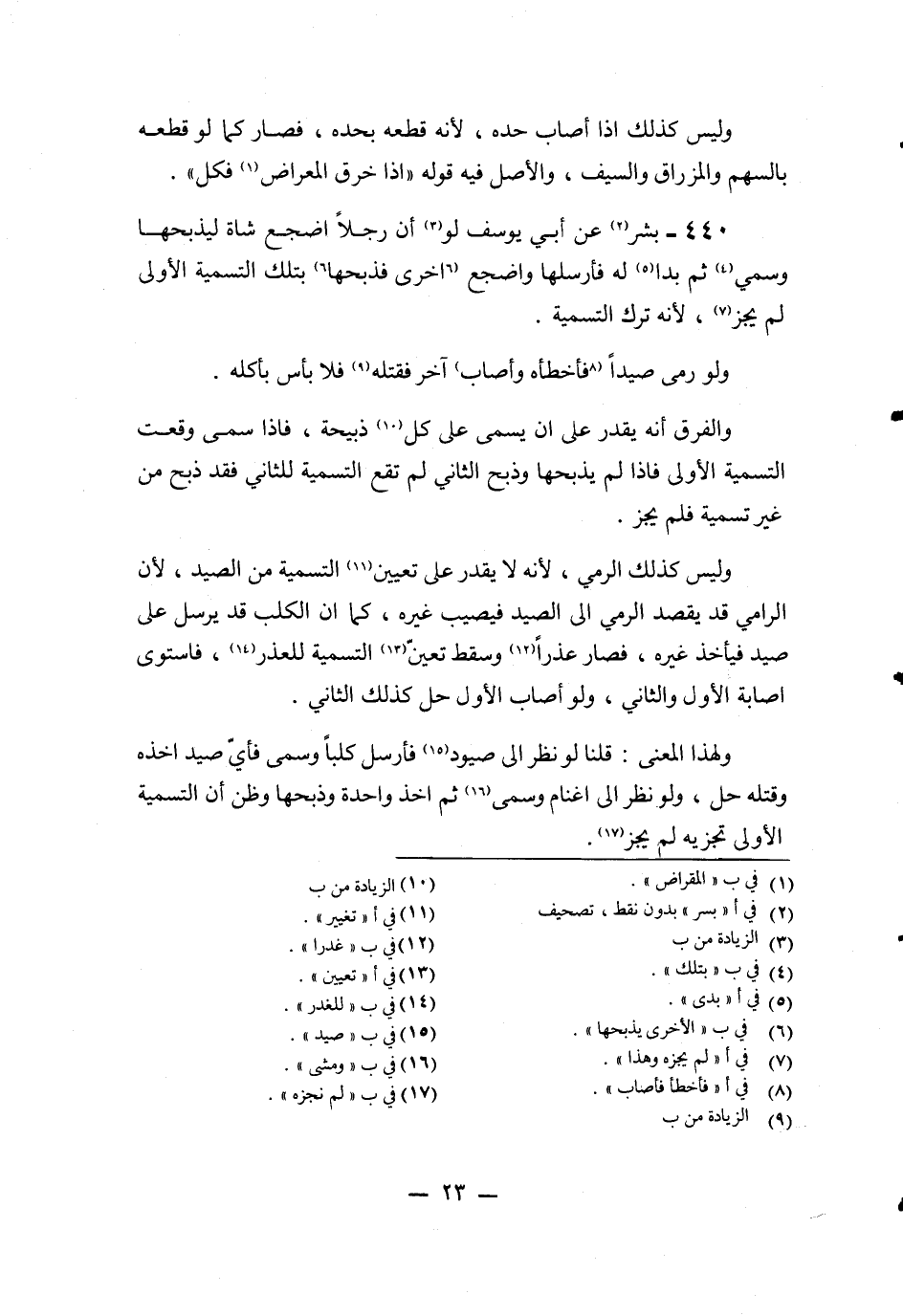 440 - بِشْرٌ عَنْ أَبِي يُوسُفَ لَوْ أَنَّ رَجُلًا أَضْجَعَ شَاةً لِيَذْبَحَهَا وَسَمَّى ثُمَّ بَدَا لَهُ فَأَرْسَلَهَا وَأَضْجَعَ أُخْرَى فَذَبَحَهَا بِتِلْكَ التَّسْمِيَةِ الْأُولَى لَمْ يَجُزْ؛ لِأَنَّهُ تَرَكَ التَّسْمِيَةَ.