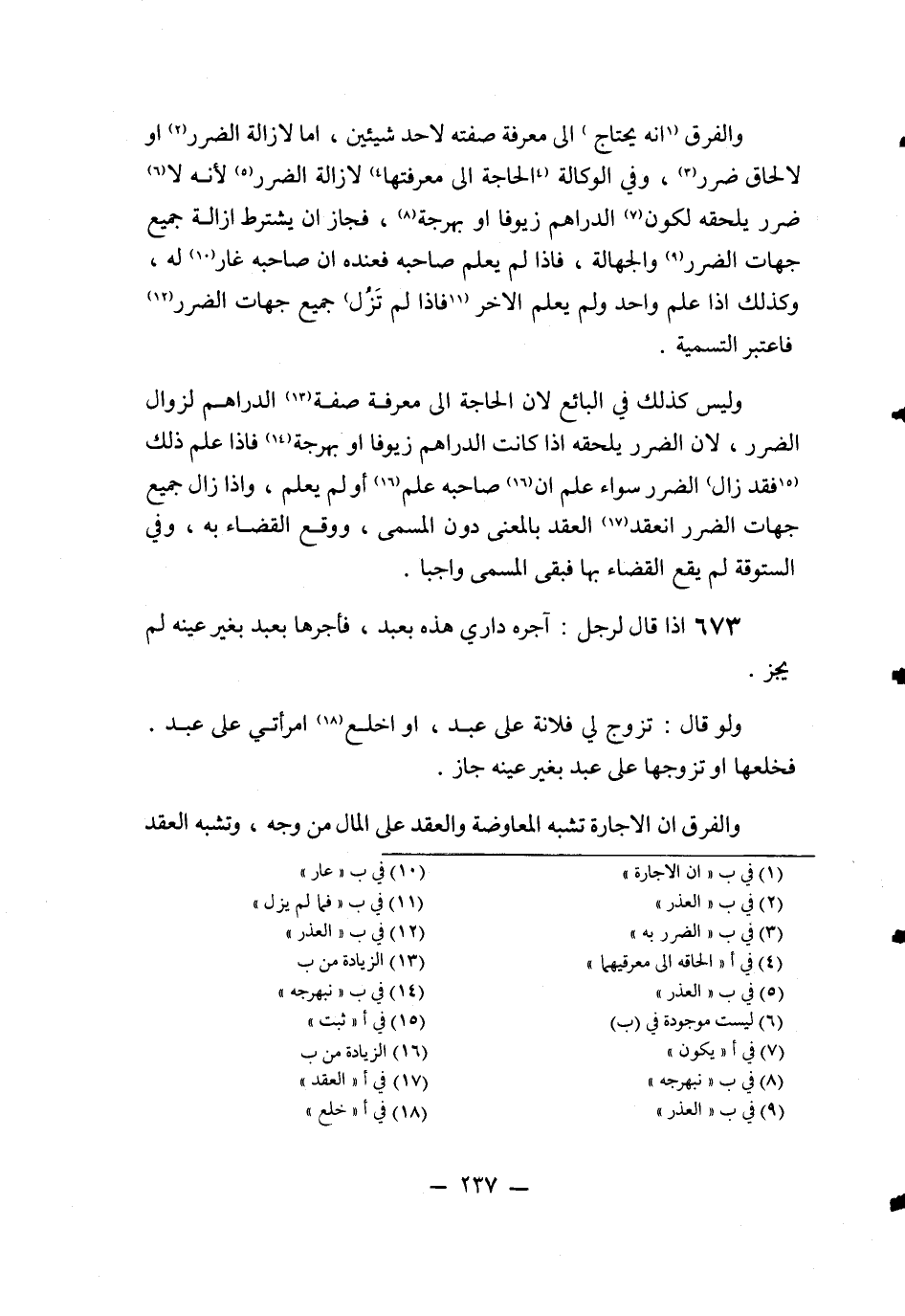 وَالْفَرْقُ أَنَّهُ يَحْتَاجُ إلَى مَعْرِفَةِ صِفَتِهِ لِأَحَدِ شَيْئَيْنِ، إمَّا لِإِزَالَةِ الضَّرَرِ أَوْ لِإِلْحَاقِ ضَرَرٍ، وَفِي الْوَكَالَةِ الْحَاجَةُ إلَى مَعْرِفَتِهَا لِإِزَالَةِ الضَّرَرِ لِأَنَّهُ لَا ضَرَرَ يَلْحَقُهُ لِكَوْنِ الدَّرَاهِمِ زُيُوفًا أَوْ بَهْرَجَةً، فَجَازَ أَنْ يَشْتَرِطَ إزَالَةَ جَمِيعِ جِهَاتِ الضَّرَرِ وَالْجَهَالَةِ، فَإِذَا لَمْ يَعْلَمْ صَاحِبُهُ فَعِنْدَهُ أَنَّ صَاحِبَهُ غَارٌّ لَهُ، وَكَذَلِكَ إذَا عَلِمَ وَاحِدٌ وَلَمْ يَعْلَمْ الْآخَرُ فَإِذَا لَمْ تَزُلْ جَمِيعُ جِهَاتِ الضَّرَرِ فَاعْتُبِرَ التَّسْمِيَةُ.