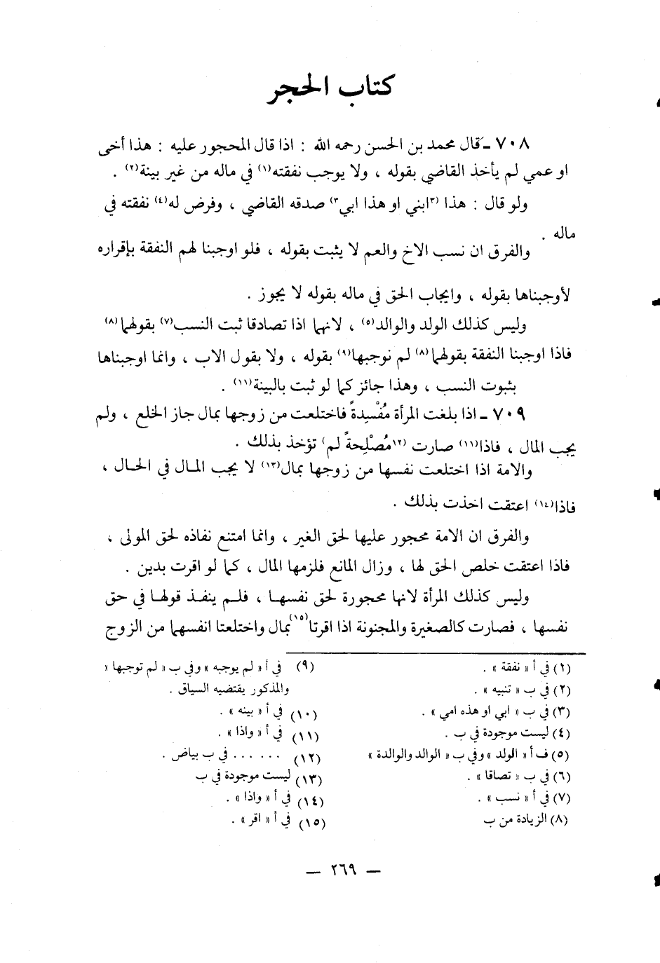 708 - قَالَ مُحَمَّدُ بْنُ الْحَسَنِ - رَحِمَهُ اللَّهُ -: إذَا قَالَ الْمَحْجُورُ عَلَيْهِ: هَذَا أَخِي أَوْ عَمِّي لَمْ يَأْخُذْ الْقَاضِي بِقَوْلِهِ، وَلَا يُوجِبُ نَفَقَتَهُ فِي مَالِهِ مِنْ غَيْرِ بَيِّنَةٍ.
