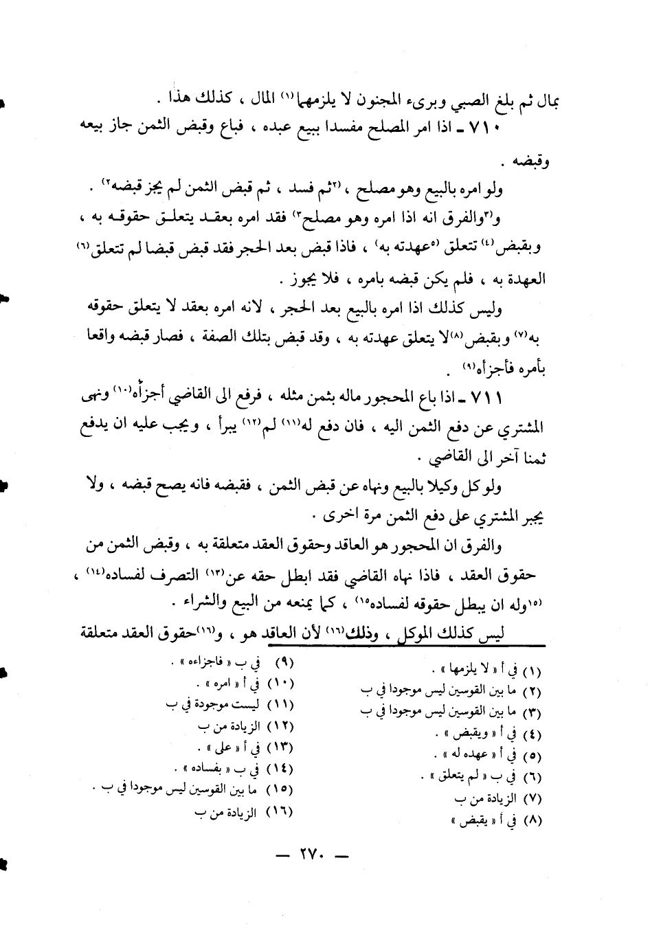 711 - إذَا بَاعَ الْمَحْجُورُ مَالَهُ بِثَمَنِ مِثْلِهِ، فَرُفِعَ إلَى الْقَاضِي أَجْزَأَهُ وَنَهَى الْمُشْتَرِيَ عَنْ دَفْعِ الثَّمَنِ إلَيْهِ، فَإِنْ دَفَعَ لَهُ لَمْ يَبْرَأْ، وَيَجِبُ عَلَيْهِ أَنْ يَدْفَعَ ثَمَنًا آخَرَ إلَى الْقَاضِي.
